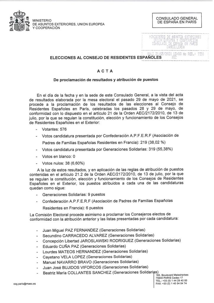 Los españoles residentes en la demarcacion consular de París contarán con un CRE (Consejo de Residentes Españoles) tras la celebración de las elecciones que ganó ‘Generaciones Solidarias’ con un total de 319 votos, frente a los 219 de ‘Confederación A.P.F.E.R.F.’ (Asociación de Padres de Familias Españolas Residentes en Francia). También se contabilizaron un total de 38 votos nulos.
