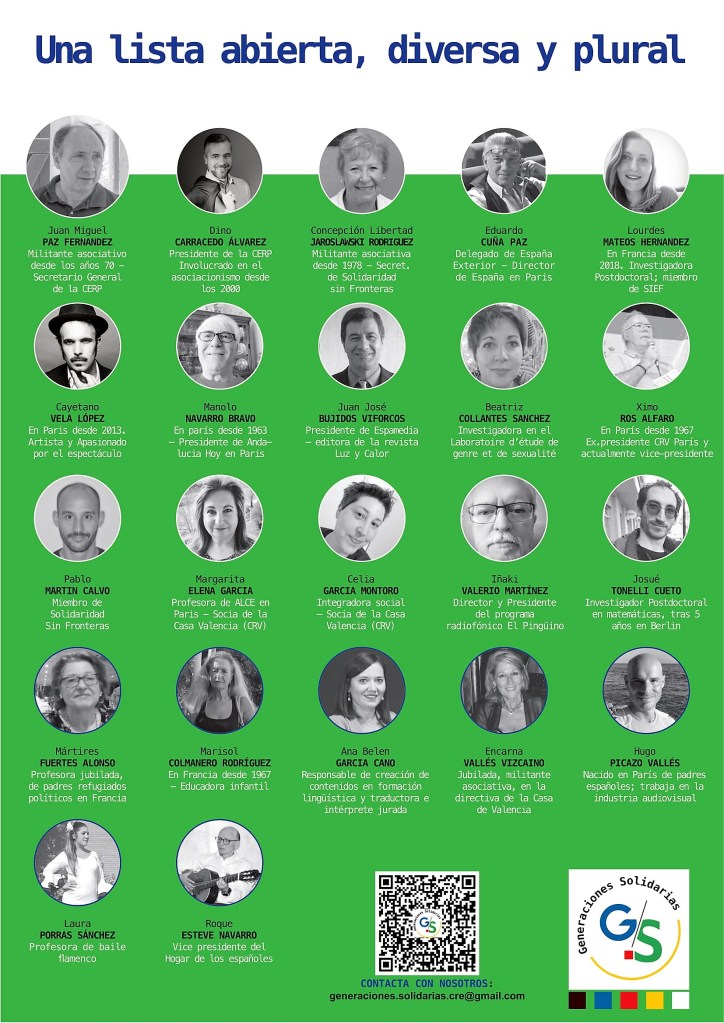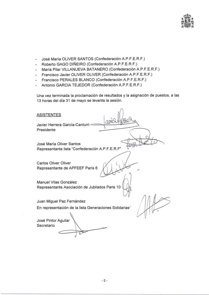 Finalmente, el CRE de París estará compuesto por Juan Miguel Paz Fernández, Secundino Carracedo Álvarez, Concepción Libertad Jaroslawski Rodríguez, Eduardo Cuña Paz, Lourdes Mateos Hernández, Cayetano Vela López, Manuel Navarro Bravo, Juan José Bujidos Viforcos y Beatriz María Collantes Sánchez, por ‘Generaciones Solidarias.