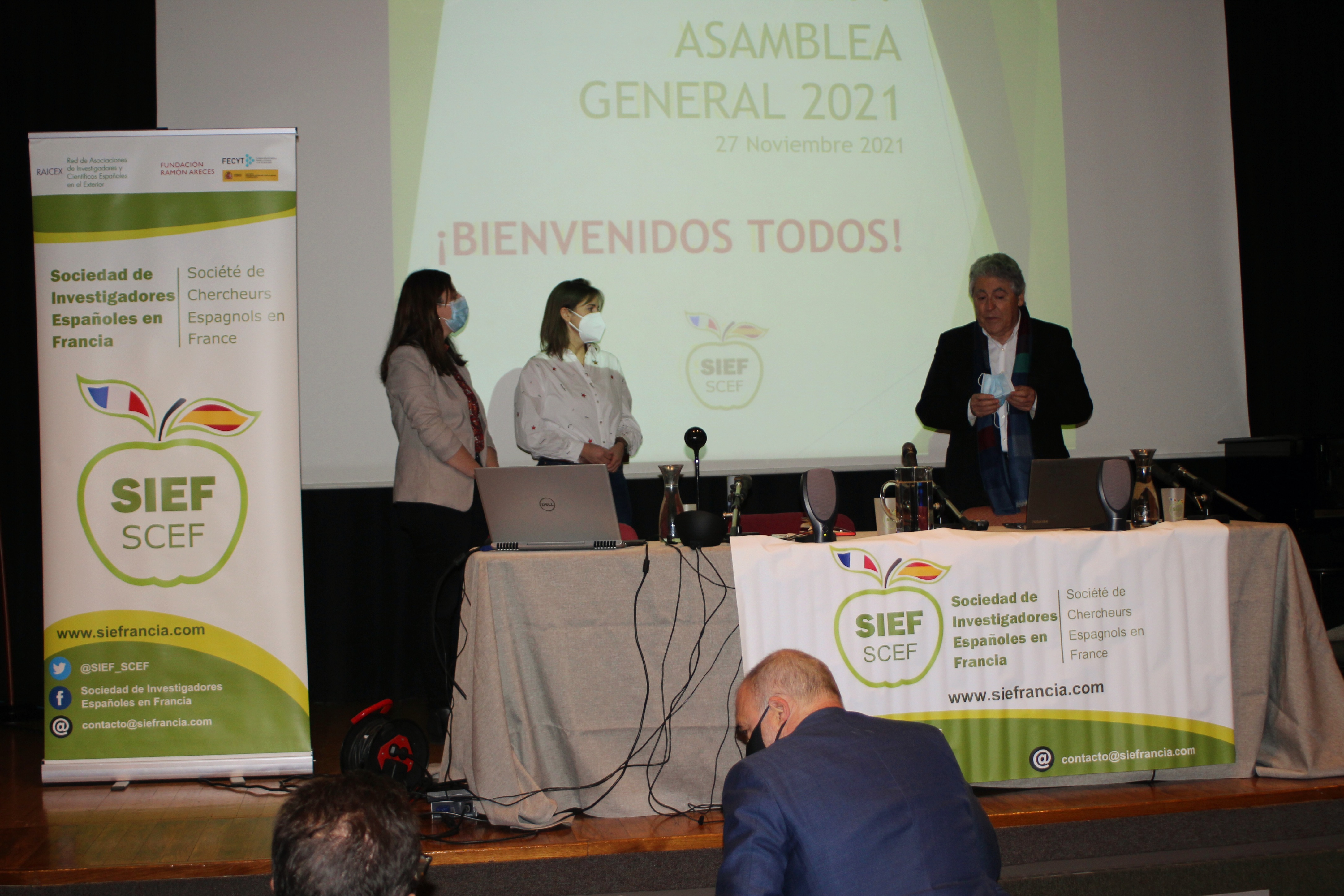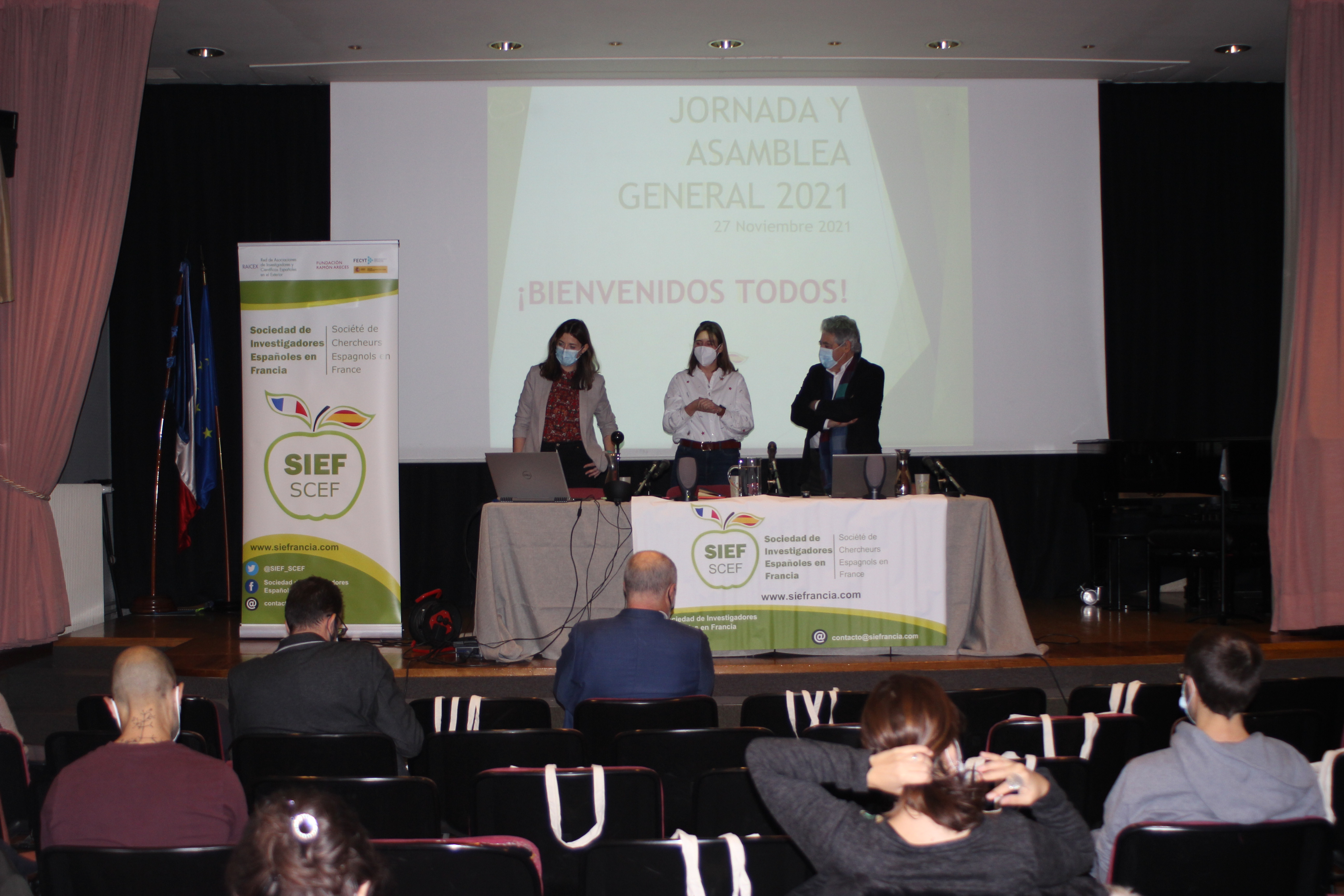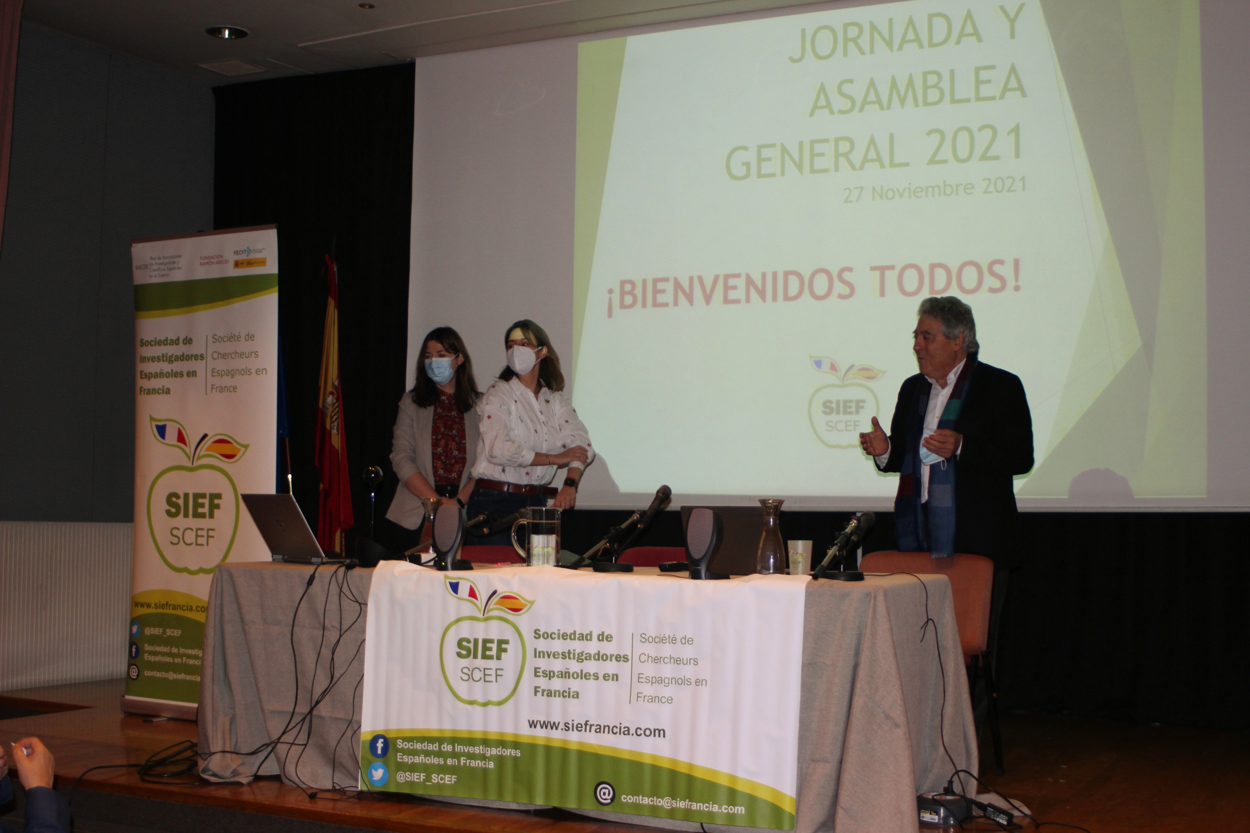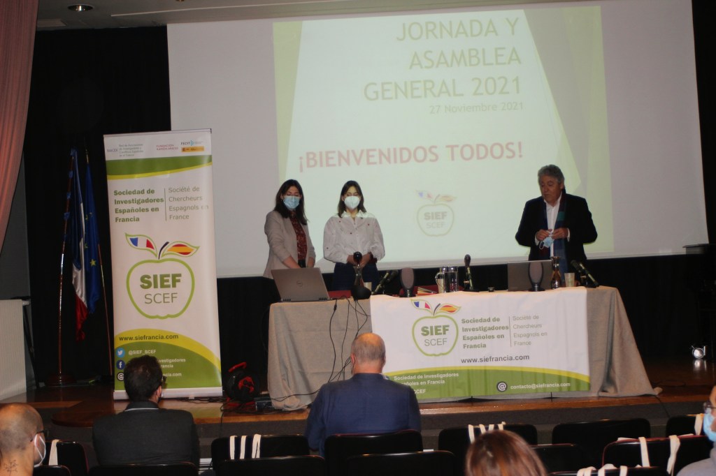 La presidenta de la Sociedad de Investigadores Españoles en Francia (SIEF), Sandra Cabeza, acompañada de Covadonga Lucas-Torres, vicepresidenta de SIEF y Arantxa Vilalta, coordinadora de SIEF para la red de investigadores en el exterior (RAICEX), abrieron la Asamblea General Anual 2021, en el Colegio de España en la Ciudad Universitaria de París.