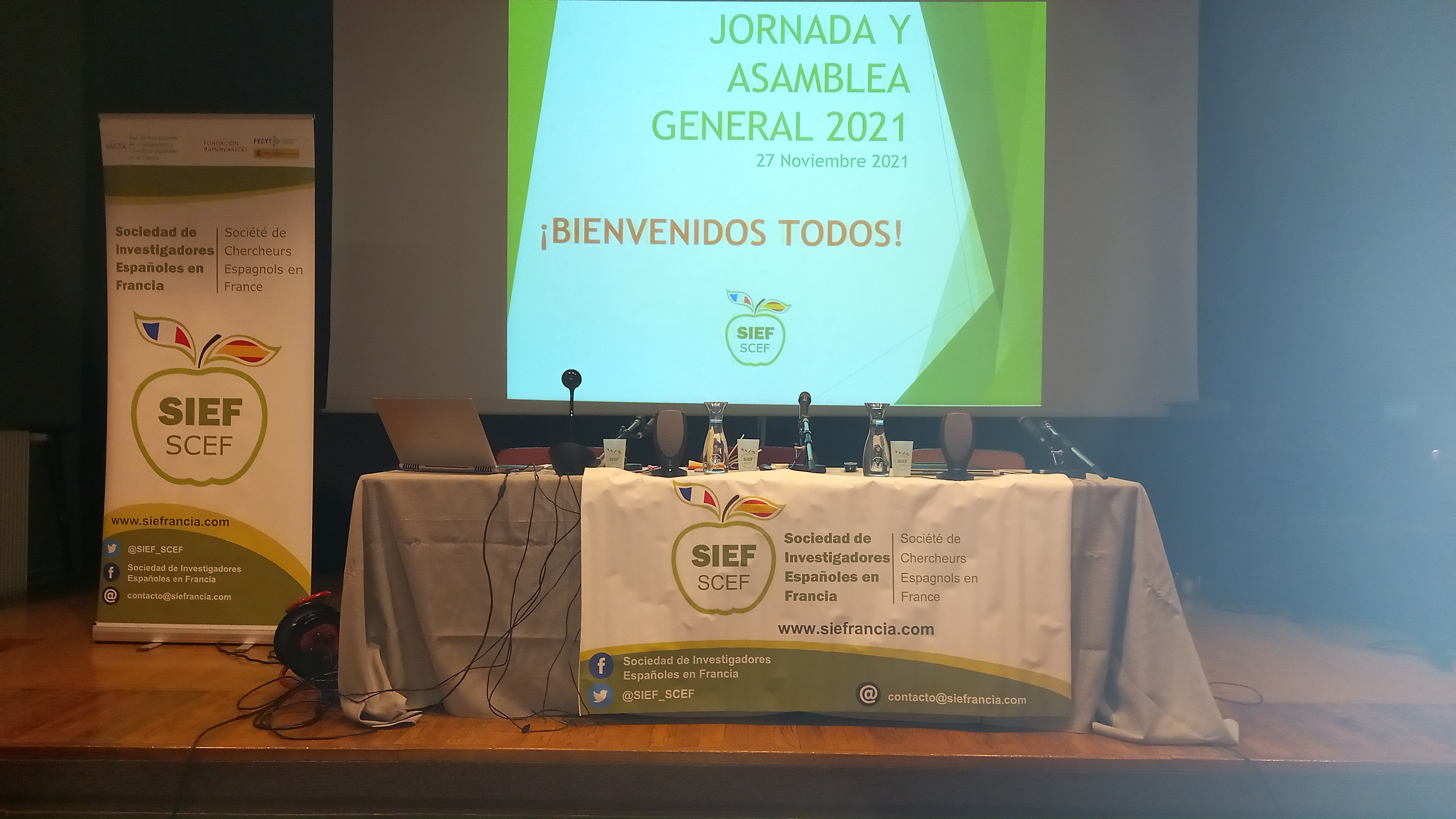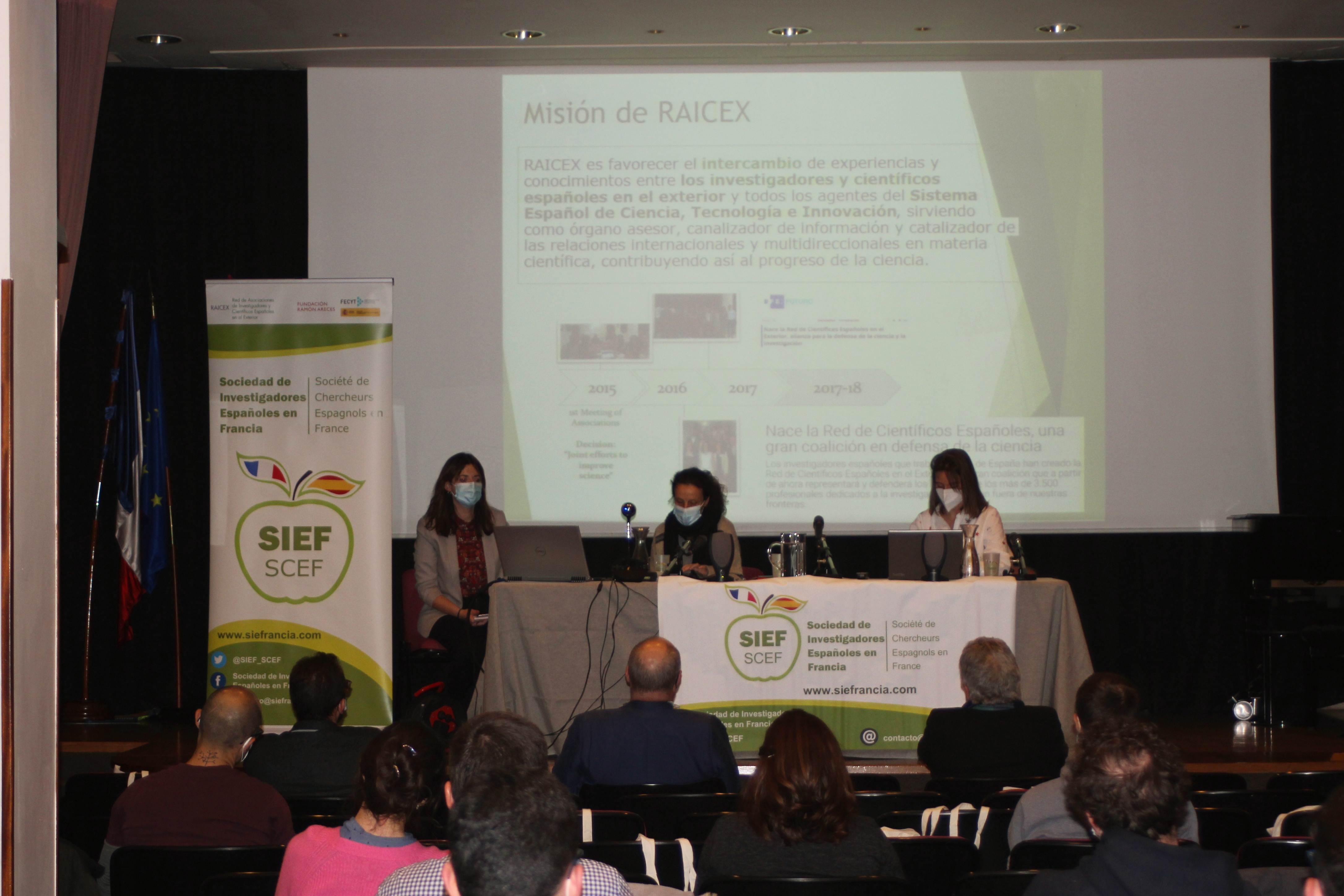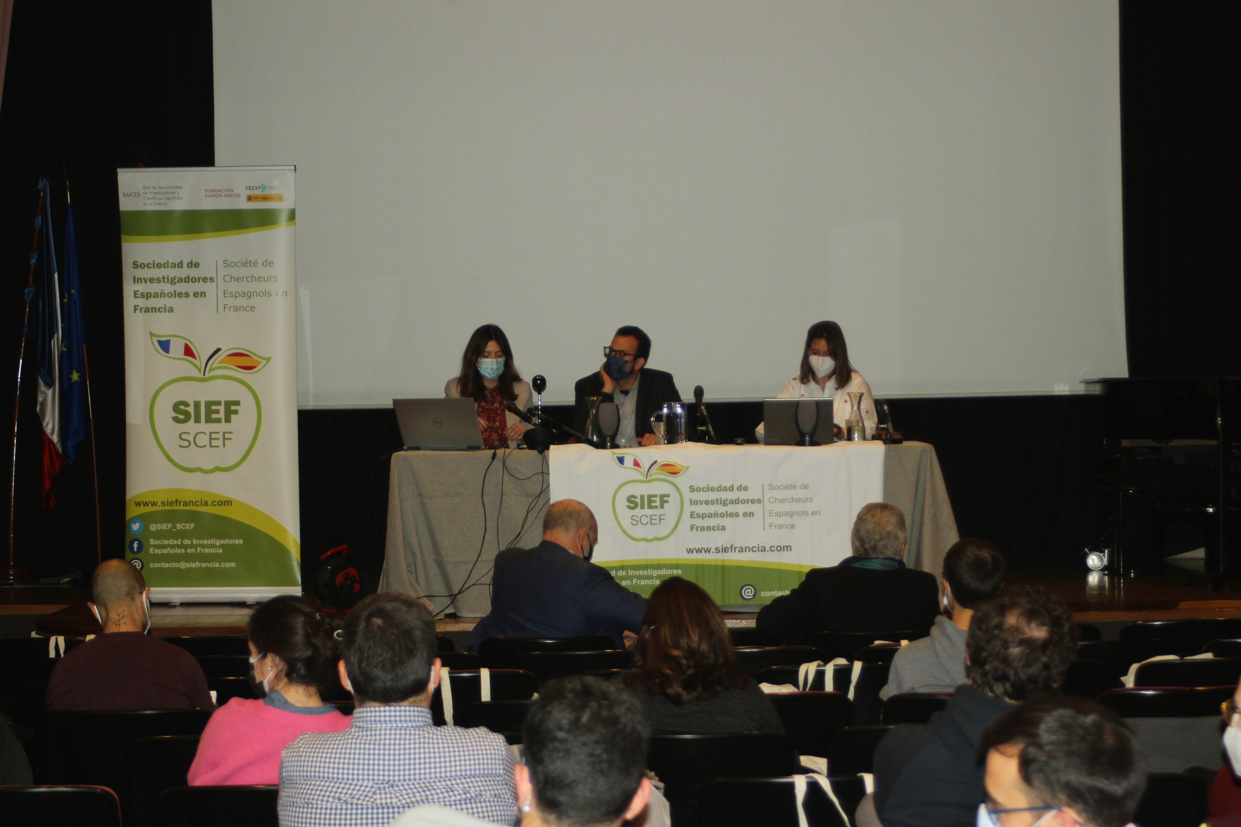 La presidenta de la Sociedad de Investigadores Españoles en Francia (SIEF), Sandra Cabeza, acompañada de Covadonga Lucas-Torres, vicepresidenta de SIEF y Arantxa Vilalta, coordinadora de SIEF para la red de investigadores en el exterior (RAICEX), abrieron la Asamblea General Anual 2021, en el Colegio de España en la Ciudad Universitaria de París.