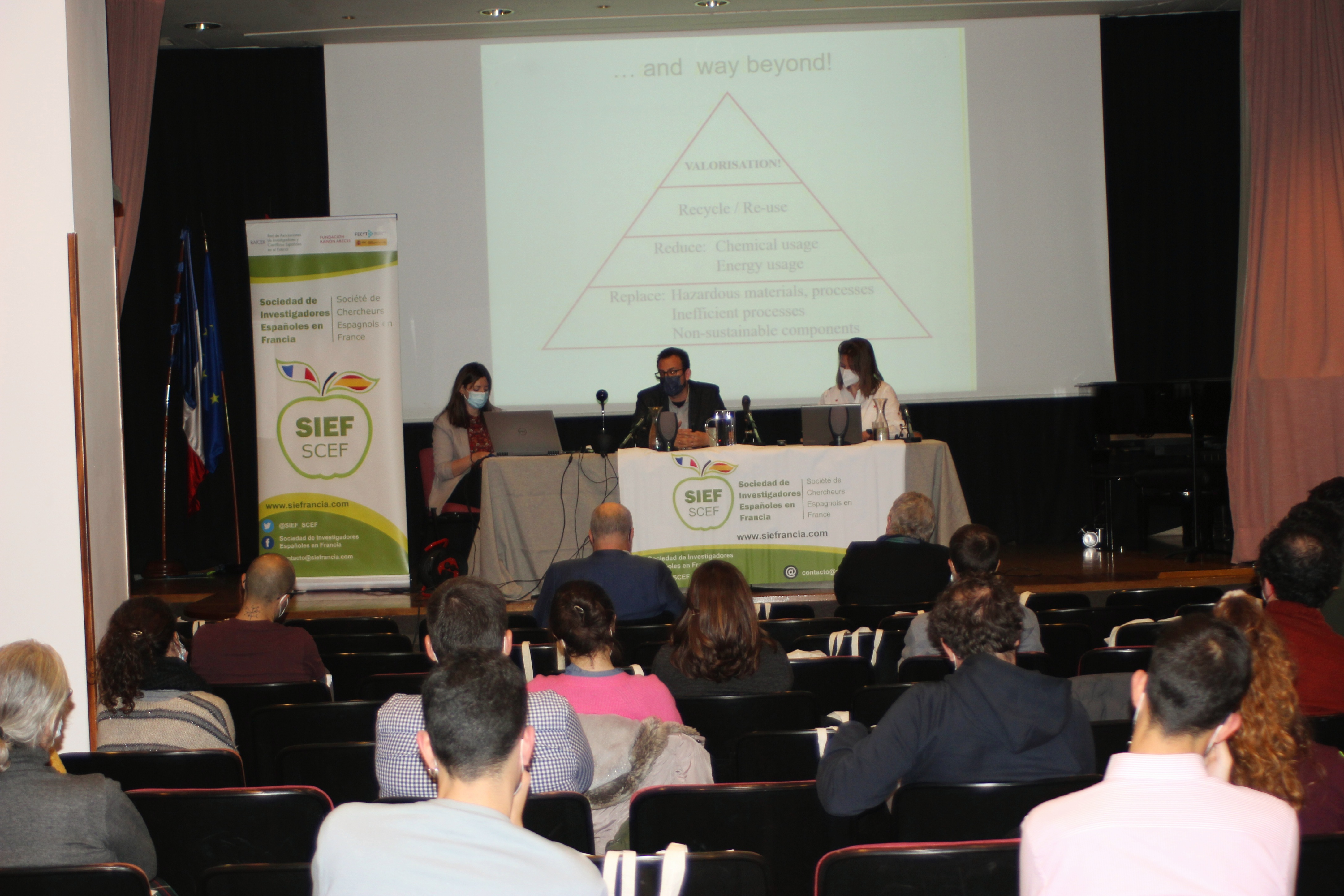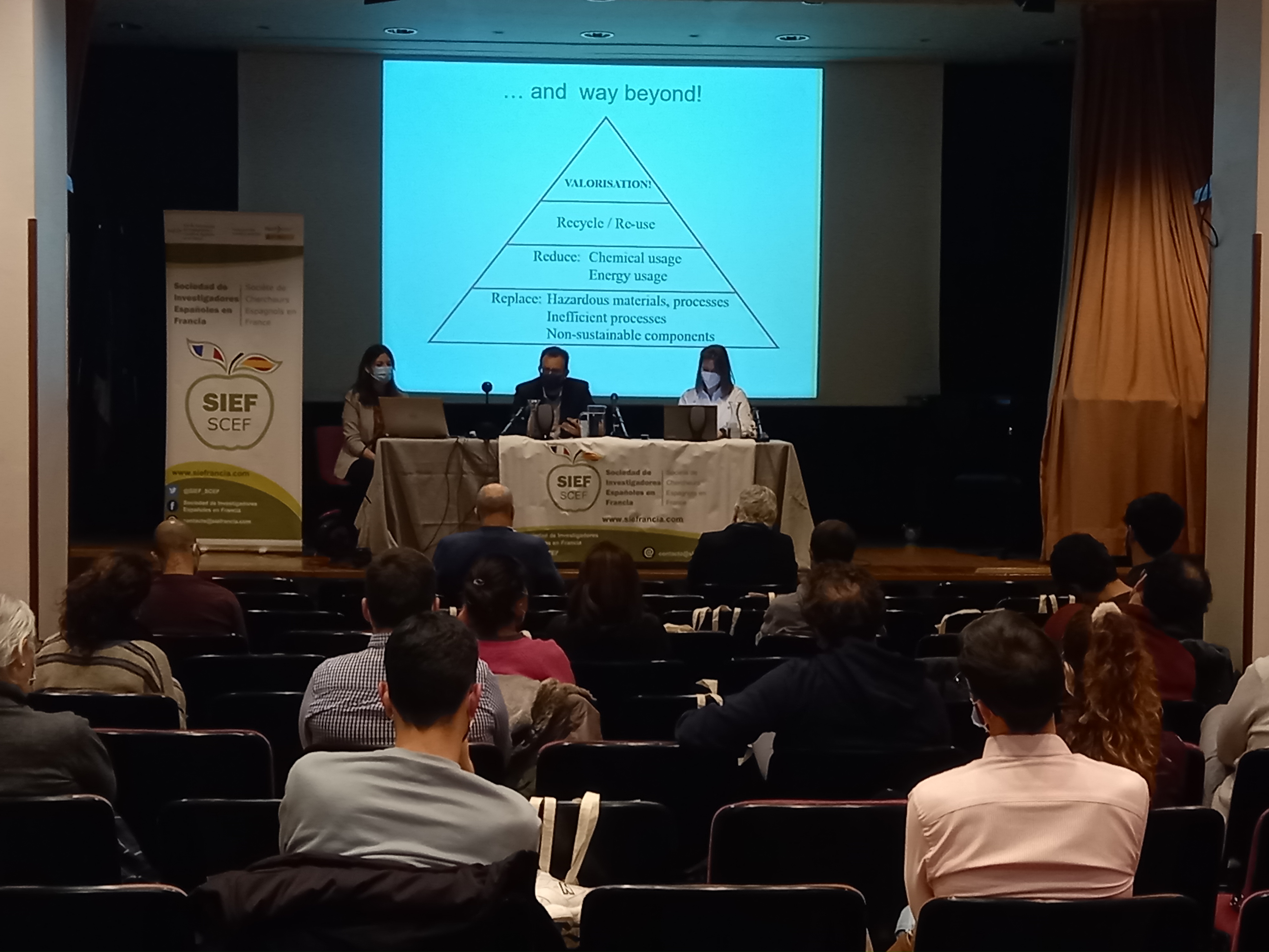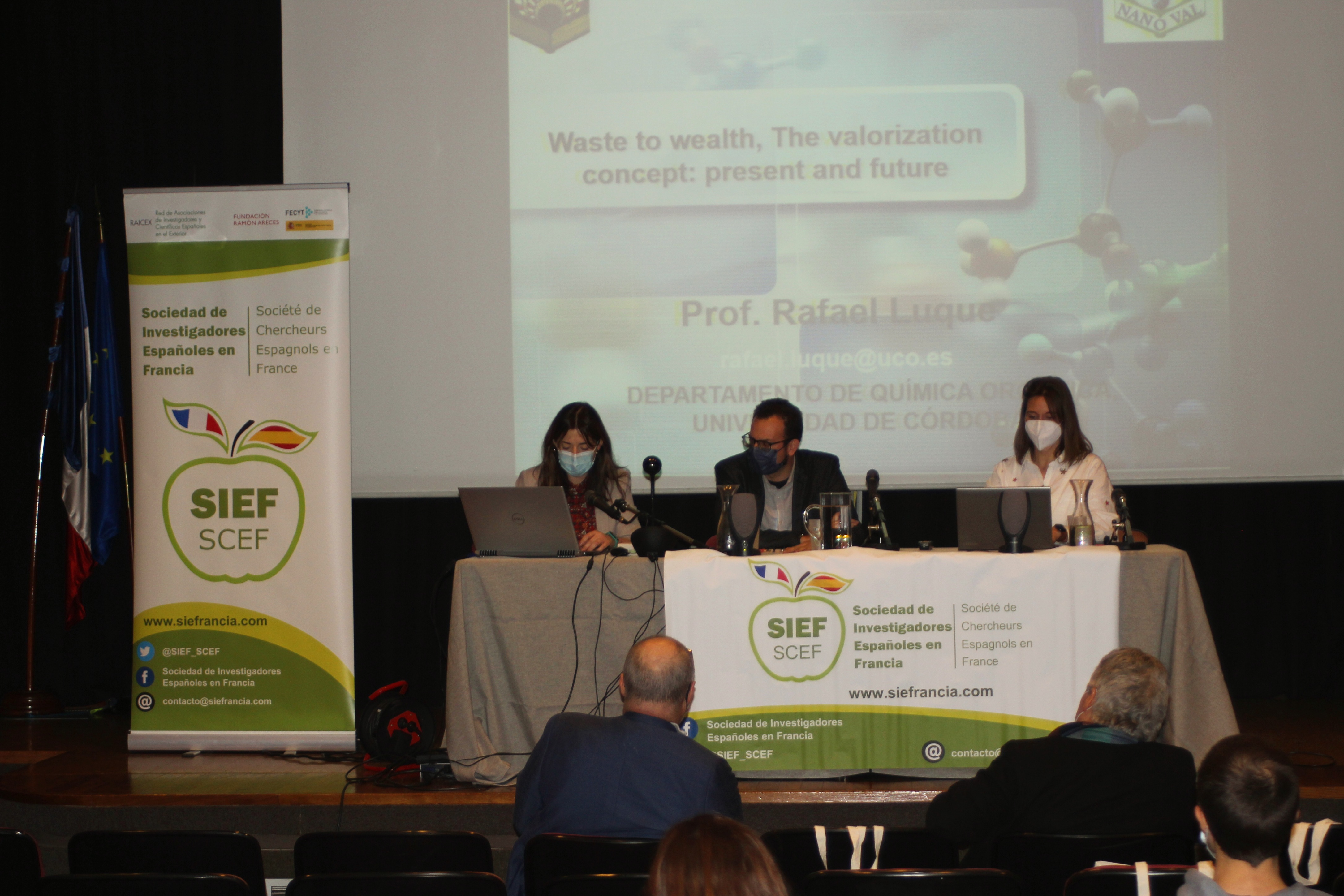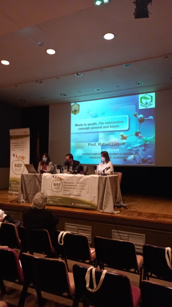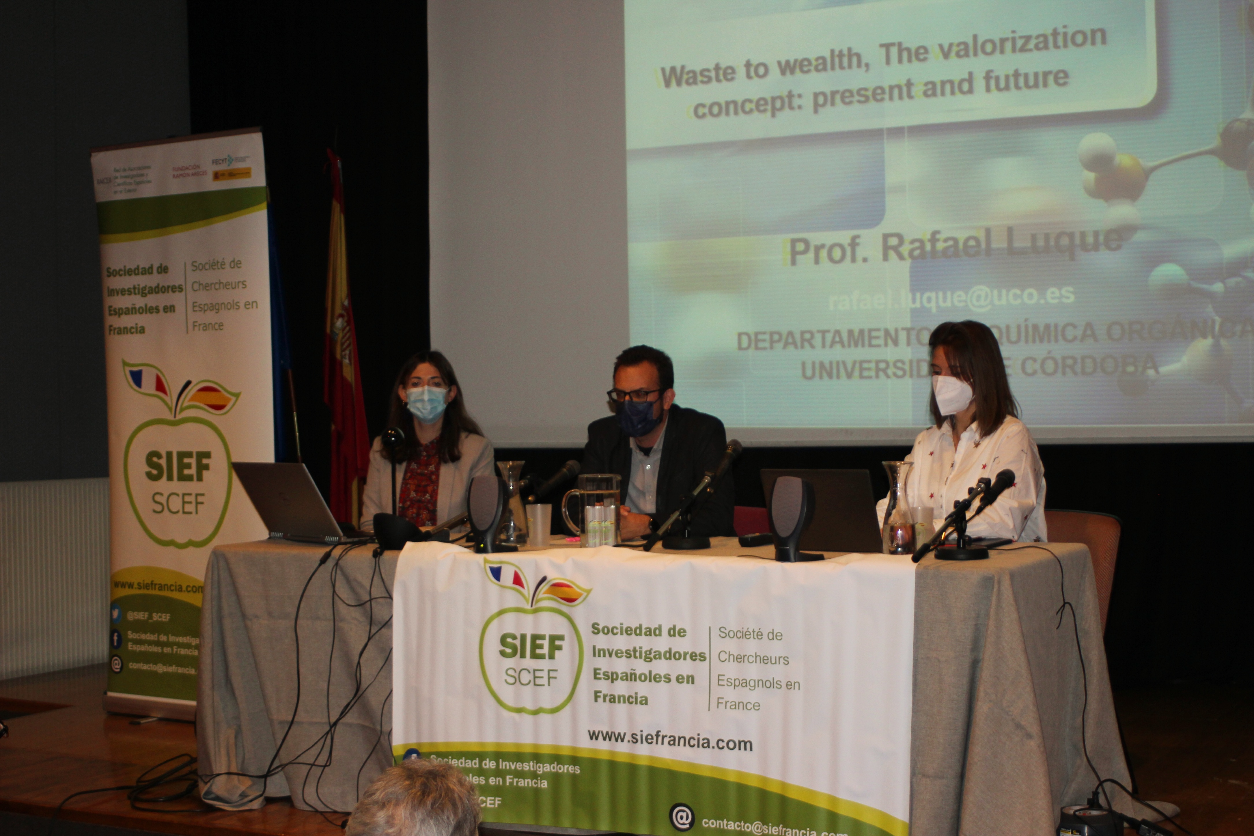La presidenta de SIEF, Sandra Cabeza presentó la asociación así como los eventos realizados desde 2018 a los presentes y a l@s que siguieron las intervenciones por videoconferencia. Al término de esta intervención, Covadonga Lucas-Torres dio la palabra al Profesor Rafael Luque (Departamento de Química Orgánica, Universidad de Córdoba, España) que ha publicado más de 600 artículos en revistas con un alto índice de impacto. Actualmente es Miembro del Consejo Editorial de las prestigiosas revistas Chemical Society Reviews, Green Chemistry, ChemCatChem, Topics in Current Chemistry and Scientific Reports, así como también es editor de la revista Journal of Molecular Catalysis A: Chemical. Ha recibido numerosos premios de relevancia internacional como son el premio “Green Talents” (2011) del Ministerio Federal de Educación e Investigación BMBF (Alemania), el premio TR35 (2012) del MIT (EEUU), “Sustainability and Energy Early Career Award” (2013) otorgado por la Real Sociedad de Química RSC (Reino Unido) y recientemente el premio “ACS Sustainable Chemistry & Engineering Lectureship” (2017) galardonado por la American Chemical Society (ACS) (EEUU).