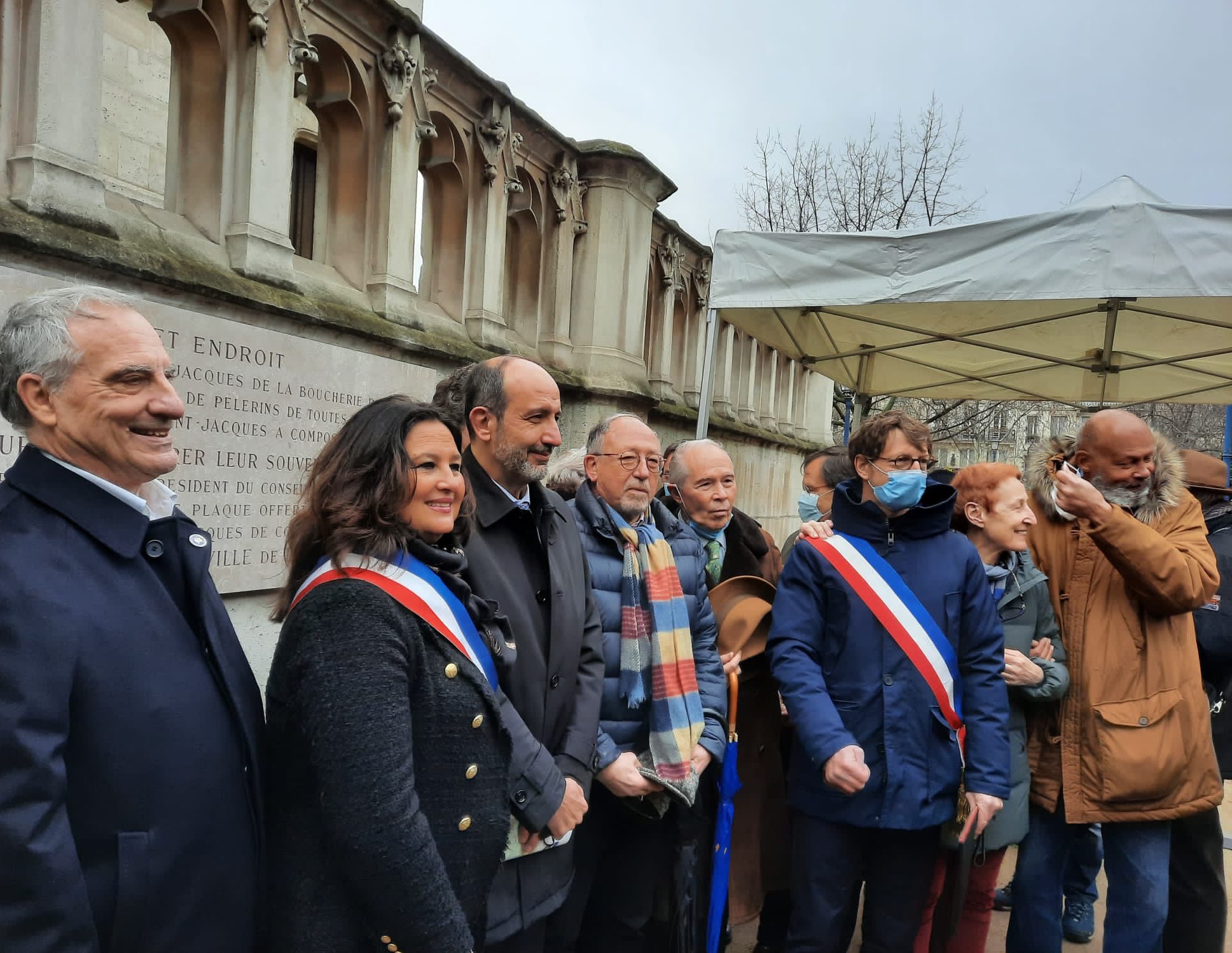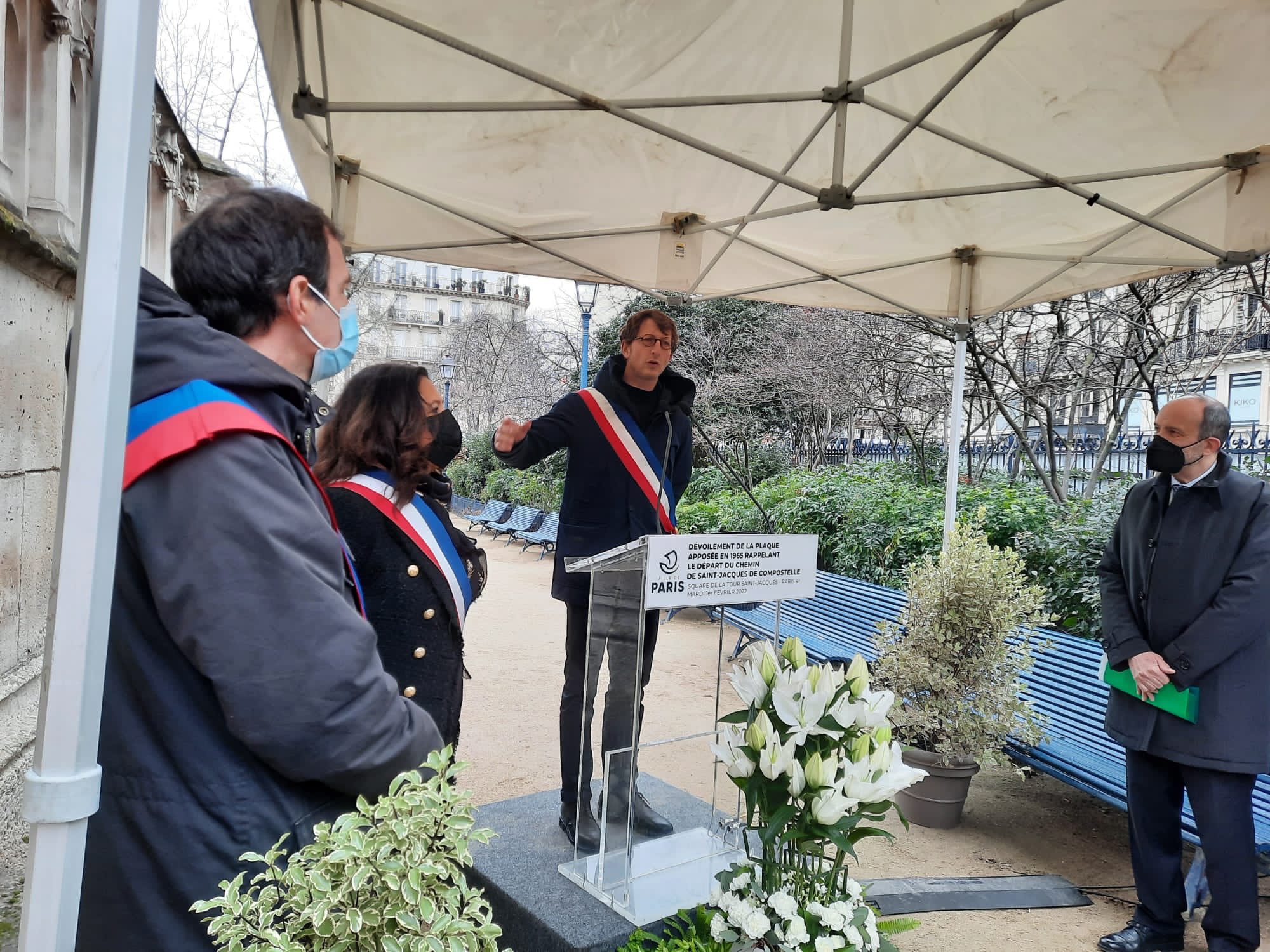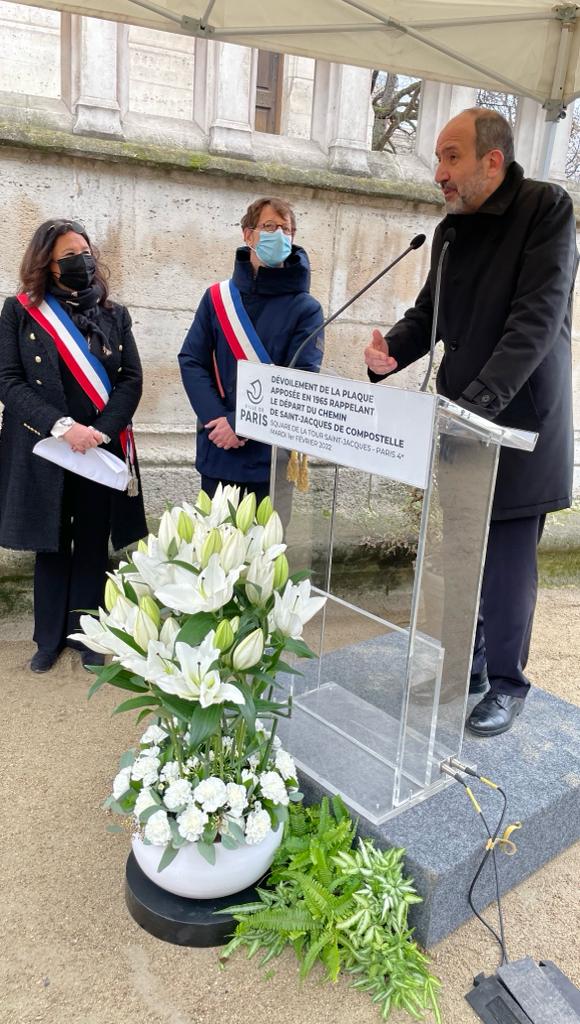 Karen Taieb,adjunta al Ayuntamiento de Paris,Patrimonio e Historia de Paris y en nombre de su alcaldesa Anne Hidalgo, Bernard Patrice y el embajador de España Victorio Baldrich, junto con miembros de la Sociedad de Amigos de Santiago de Compostela