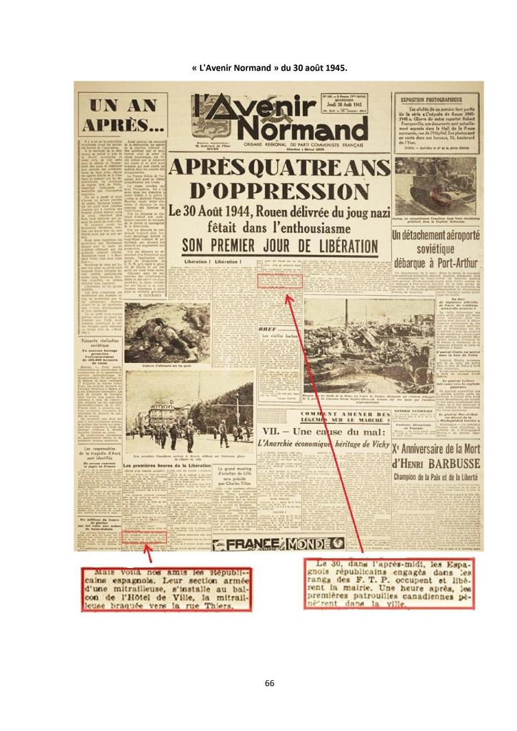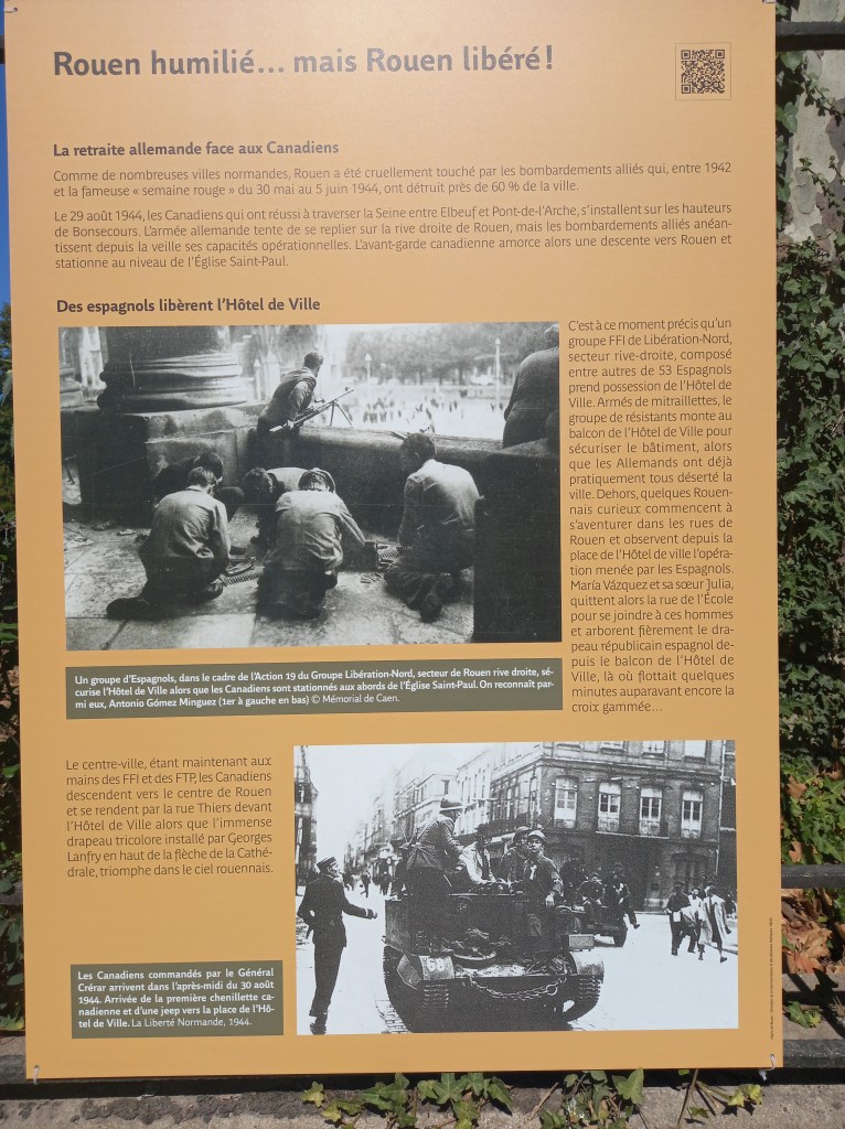 Asi mientras los alemanes se batian en retirada por los alrededores, fue un grupo de Resistentes Españoles, junto con las FFI,quienes,como avanzadilla,tomaron el control del ayuntamiento,en espera de la tan ansiada llegada del ejército canadiense, punta de lanza de los aliados en la liberación de Rouen.