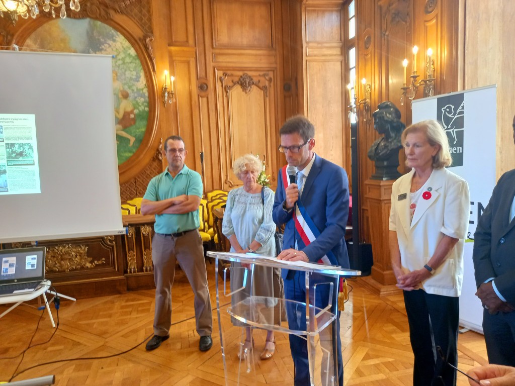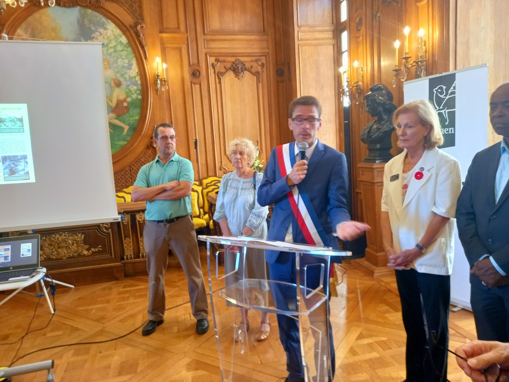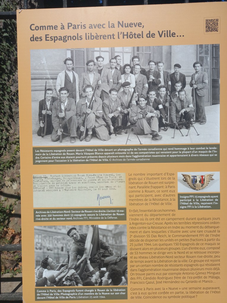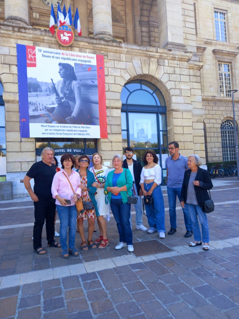 78eme Aniversario de la Liberacion de Rouen homenaje a los Republicanos españoles que Liberaron Rouen,al acto celebrado en los Salones del Ayuntamiento de Rouen asistieronNicolas Mayer-Rossignol alcalde de Rouen, )que en su discurso y à proposicion de Roberto Sánchez dejo entrever,que proximamente un edificio o una calle de Rouen llevara el nombre de Maria Vazquez)embajadora de Canada en Francia Isabelle Hudon,Matthieu de Montchalin,Adjunto del ayuntamiento encargado de asuntos generales,Kader Fhin Consejero municipal delegado en carga de Asuntos Militares y Antiguos Combatientes,Roberto Sanchez Ingeniero Civil al origen de de esta descubierta y al origen de la exposicion Rouen y los Republicanos Españoles 1937-1945 exposicion realizada por alumnos y profesores de 3 del Colegio Leonard de Vinci (Bois-Guillaume)y el 1er Bachibac del LiceoVal de Seine(Le Grand-Quevilly)