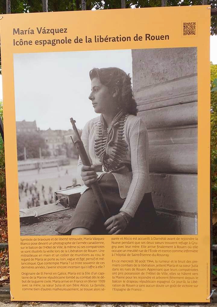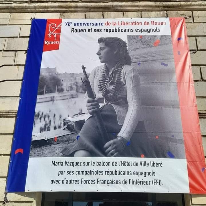 Así, en aquellos días de finales de agosto del 44, mientras los alemanes se retiraban, un grupo de maquis Los españoles, en apoyo a las FFI, aseguraron el ayuntamiento, a la espera de la llegada del ejército Canadiense, punta de lanza de los Aliados en la liberación de Rouen, ciudad desolada y medio destruida, pero finalmente, después de cuatro años, liberada. De los españoles de aquella época sólo quedan algunos nombres que aparecen en la foto del grupo tomada por Ken Belle al día siguiente de la liberacion de la ciudad,ocho años de devastación, miedo, miseria y tristeza le han valido esta pose, donde María aparece en el centro. A su alrededor vemos a José Hernández, Francisco Gazull, Francisco Rodríguez, su hermano Càndido, Gerardo “le Manchon” y otros rostros anónimos.La niña del balcon se llamaba María Vázquez Blanco. Era hija de un capitán de la Armada Republicana, Alicio Vázquez Hinojosa, quien murió en acción poco después del inicio de la Guerra Civil Española, el último día de agosto, en Llerena (Badajoz), sus restos nunca se encontraron Tras la caída del frente del Ebro, último baluarte de la República española, María, su hermana Julia,su hermano Alicio y su Madre, parten de Madrid con el Estado Mayor General de la armada, en el mes de noviembre de 1938, para llegar a Valencia. Luego siguieron un triste camino hacia Barcelona, luego Cadaqués y finalmente Francia,entrando por Le Perthus en un día de nieve en febrero de 1939.Toda la familia llego a Grugny, un pequeño pueblo de pocas casas,en las cercanías de Rouen, pero dotado de un hospital y un asilo que, irónicamente, sirvió como campo de internamiento para soldados alemanes después de la Primera Guerra Mundial . Como tantos otros refugiados, la familia se instaló en condiciones de gran pobreza:Un frío extremo,hambre insatisfecha,durmiendo en el suelo helado, tendrán una vida terriblemente dura durante varios meses. Alicio, ya casi un hombre, va a ser separado de su familia y trasladado a Grosfy, a un centro para refugiados adolescentes, como lo veremos luego. María, que tiene algunos conocimientos de enfermería, encuentra trabajo en un hospital en Saint-Etienne du Rouvray, cerca de Rouen. Así es como ella logra hacer venir su madre y hermana a la ciudad,de Rouen,calle de las escuelas ( rue de l'écoles). El calvario del racionamiento y el hambre constituirá la parte principal de sus memorias de esta época: “Podríamos viajar hasta 50 kilómetros a pie en busca de comida, regresando a veces al hogar con un huevo, o nada »La Liberación se vive con emoción y lágrimas.,poco a poco la multitud sale a la calle,se pone la ropa más bonita para reír, saludarse, bailar y besarse.!odo parece posible de nuevo!. Mientras se iza la bandera francesa en el balcón del ayuntamiento , María y su hermana Julia suben a la terraza del consistorio con su bandera republicana Española. Julia cree haber visto sus fotos en un periódico, pero ya no estarán publicado. Setenta y cinco años sepultarán en el olvido este feliz día.En Rouen de la posguerra llega el momento de la reconstrucción y la esperanza para el futuro.Sin embargo, para muchos españoles en Rouen, la esperanza de volver a su tierra natal se está desvaneciendo. El 14 de octubre de 1944, el hermano de María y Julia muere en combate en las filas del 2.División Blindada de Leclerc,a penas diez días después de cumplir los 20 años, la Invasión de la Val d'Aran, último intento de ampliar la Guerra contra Franco en España, acaba en derrota total.Una vez finalizada la fiesta y perdida la esperanza de un pronto regreso a casa, los exiliados deben considerar su futuro en Francia o en otro país. Julia, la hermana de Francisco, se casa con otro refugiado español, ya principios de 1946 parten hacia Argentina, luego Venezuela, donde se establecieron.El primo Francisco Bértalo y su mujer María, con sus hijas Libertad y Françoise,logran instalarse y prosperar modestamente en Rouen, donde Francisco encuentra un empleo como electricista en Chantiers de Normandie. María Vázquez, por su parte, se enamora de un soldado estadounidense y de camino a su futuro, ella se disfraza de hombre y viaja clandestinamente en el mismo barco que el soldado, con destino a los Estados Unidos, en otoño de 1945.