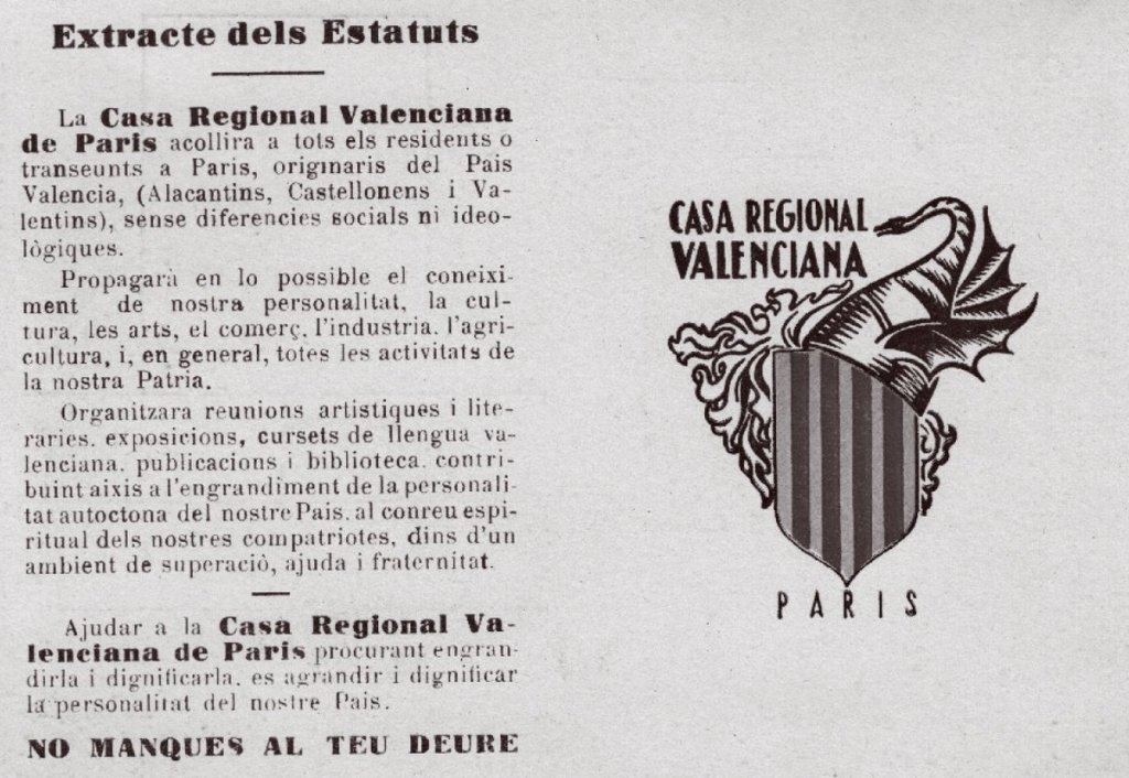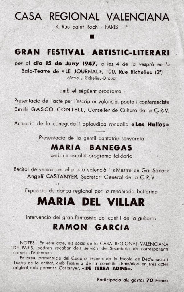 La entidad constituida por extranjeros no podía tener un carácter político pero estaba -como hubiera dicho el censor franquista que abolió la Sociedad de Autores Valencianos- «embebida» de valencianismo y de antifranquismo». Publicaba un boletín con la dirección de la sede que estaba en el 4, rue Saint Roch, en el distrito 1er. parisino. El editorial del número 1, titulado «Valencians», reproduce el primer artículo de los estatutos que acaba con un Visca el País Valencià: «a demanda de constitución legal de la asociación a las autoridades francesas se realizará con el nombre oficial de CASA REGIONAL VALENCIANA DE PARIS. Angeli Castanyer había propuesto el nombre de CASAL VALENCIANO y José, en una carta a Gaetà Gaetà Huguet que en ese momento era el presidente del Bloc y que debía protestar por no haberse mantenido el nombre inicial, explica el motivo: “Una de las razones por las que no pudimos imponer el nombre de Casal Valencià -Gascó (Contell) es testigo-, fue el anticatalanismo de muchos valencianos mantenido por la ignorancia lamentable de los valencianos que creen que Casal es palabra catalana. Es deplorable pero los hechos son superiores a nuestra voluntad. El léxico del boletín, continúa José, ha merecido el calificativo de catalanista y contra esto nosotros luchamos con todas nuestras fuerzas, procurando que la gente salga de la oscuridad en que se encuentra haciéndole conocer su lengua (…)” Las adhesiones que irán recibiendo permitirán convocar una primera reunión de carácter general. Llegan respuestas de distintos puntos de Francia y también de Bélgica. La asociación contará con socios corresponsales de todo el exilio, en Burdeos, en La Habana, en Toulouse y en Argelia. La asamblea general constituyente de la CASA REGIONAL DE PARÍS se celebra el 23 de marzo de 1947, y sin duda por la eufória del momento de un París liberado y de la influencia de Amadeo Granell, el acto tiene lugar en los salones del “Club Amicale de la Résistance” de París. En el acta consta que el primero en hacer uso de la palabra es Josep Castanyer que da cuenta de los trabajos realizados por la comisión «extendiéndose en las razones de sentido práctico y de fondo patriótico por las que» se creaba la asociación, y haciendo remarcar la presencia en la asamblea de Juli Just Gimeno “en ese momento Ministro de Defensa e Interior del gobierno republicano exiliado, al que se consideraba obligado a cederle el uso de la palabra, como la personalidad más representativa en aquellos momentos y la mejor que podía valorar los propósitos que a todos les animaba.” En su parlamento Juli Just expuso “las razones de todo tipo que habían debido inspirar la creación de la casa Regional Valenciana de París, a la que tenía el honor de haberse adherido desde el primer momento y de la que se ponía completamente a disposición en todo cuanto pudiera serle útil tanto en el terreno estrictamente personal como en el de los cargos públicos que en el momento ostentaba.” En esta asamblea constituyente tomaron la palabra otros asistentes entre ellos, Amade Granell. El primer Consejo Directivo de la entidad quedó constituido por aclamación, de la siguiente forma: “Presidente, Josep Castanyer i Fons; Vice-Presidente, Amadeu Granell; Secretario General, Angelí Castanyer y Fons, Tesorero, Salvador Casterà; Consejero de Cultura, Emili Gascó Contell; de Economía, Mario Soler Nicolas, de Interior, Antoni Ferrandis Garcia; de relaciones, Ferran Delvar, de Asistencia Social, dr. Rafael Vilar Fiol.” La entidad constituida por extranjeros no podía tener un carácter político pero estaba -como hubiera dicho el sensor franquista que abolió la Sociedad de Autores Valencianos- «embebida» de valencianismo y de antifranquismo”. Publicaba un boletín con la dirección de la sede que estaba en el 4, rue Saint Roch, en el distrito 1er. parisino. El editorial del número 1, titulado “Valencians”, reproduce el primer artículo de los estatutos que termina con un Viva el País Valencià: “La casa Regional Valenciana de París, acogerá a todos los residentes o transeúntes en París, originarios del País Valencià ( Alicantenos, Castellonenses y Valentinos). Para acabar con estos términos… contribuyendo así al agrandamiento de la personalidad autóctona de nuestro País y al cultivo espiritual de nuestros compatriotas, dentro de un ambiente de superación, ayuda y fraternidad. Viva el Paía Valenciano”. A continuación el Boletín relata el primer acto de la asociación, un festival celebrado justo después de la asamblea constituyente de la que la prensa y radio dieron cuenta. Reproduce el parlamento de Emili Gascó Contell en el acto en calidad de conseller de Cultura que acaba también con un “Viva el País Valenciano”; informa sobre el recital de poesía que da Angelí Castanyer, y seguidamente se detalla las diferentes actuaciones artísticas que participan en la velada con la actuación de una fábula, de cantantes, guitarristas, y ballet. Al final del acto, los hermanos Castanyer como secretario general y presidente de la entidad tomaron la palabra con estas palabras del presidente: «Gracias a todos, y, por nuestra parte, procuraremos superarnos siempre en beneficio de nuestra patria.» Para saber cómo se financiaba la entidad además de la cuota de socios, disponemos de la liquidación de un Festival organizado en la Sala des “Sociétés Savantes” el 14 de diciembre de 1947 con 325 entradas vendidas y un beneficio de 9.107 francos de la época. En los gastos no figura ninguna partida «colaboradores artísticos», todos participaban benévolamente. Esta fórmula de organizar actos rentables constituía, aparte las cuotas de los socios, la forma de financiarla