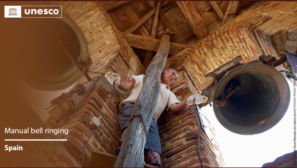 El toque manual de campanas español forma parte desde hoy de la Lista Representativa de Patrimonio Cultural Inmaterial de la Humanidad de la UNESCO. La decisión ha sido adoptada por el Comité del Patrimonio Cultural Inmaterial de la UNESCO reunido esta semana en Rabat (Marruecos).