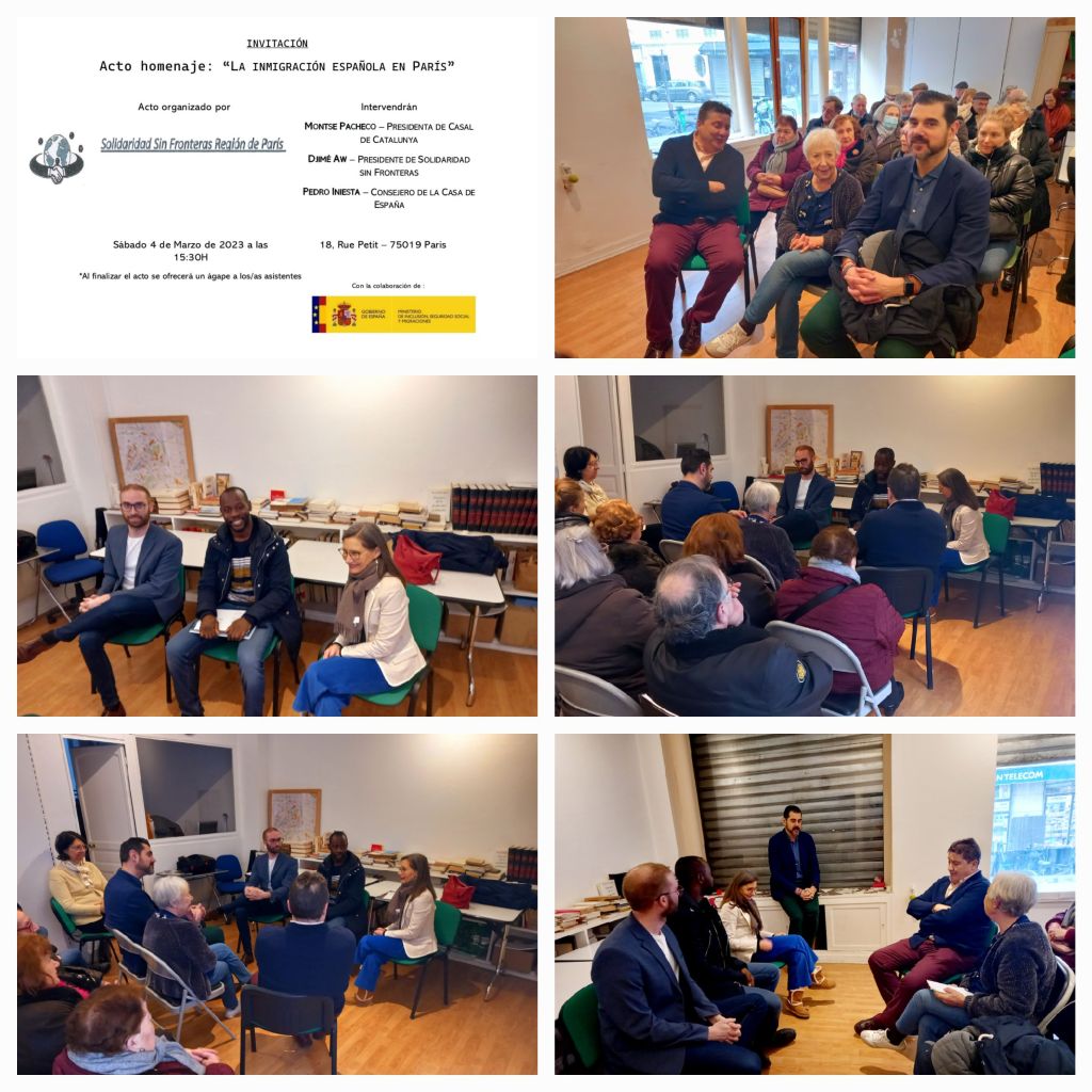 El sábado 4 de Marzo se celebro un acto de Homenaje a la Emigración Española en Paris Organizado por Solidaridad sin Fronteras y con la participación de Montse Pacheco ,presidenta del Casal de Catalunya (1947) Djime Aw présidente Solidaridad sin Fronteras, Pedro Iniesta Consejero de la Casa de España en la Región Parisina y el Consejero de Trabajo Migraciones y Seguridad Social Daniel Jesús Solana Gázquez