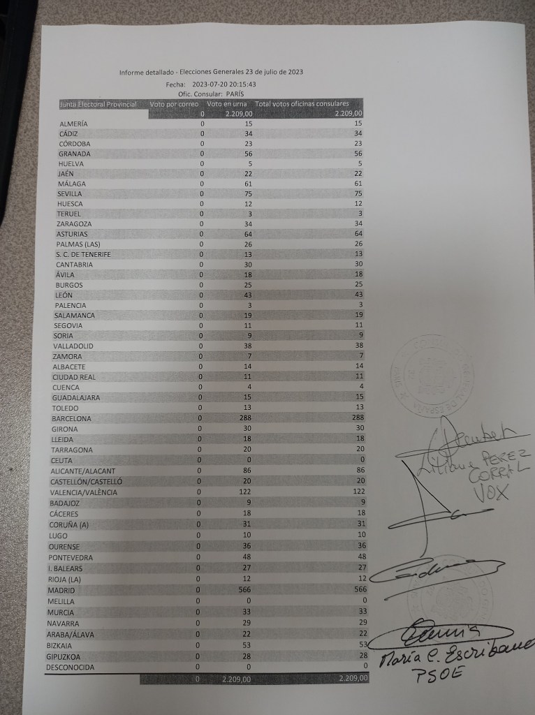 En el Consulado général de España en París, se recibieron 11.473 votos por correo,los cuales se repartieron à las diferentes provincias à los que iban destinados (52)