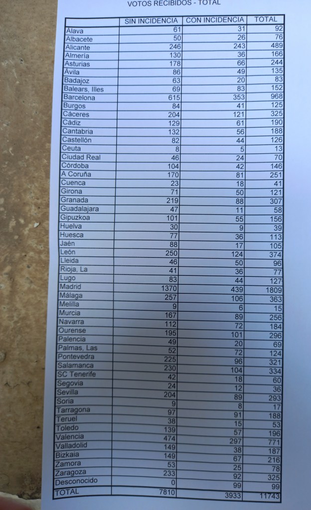 De estos 11.473 votos recibidos ,se constatation 3933 votos con: incidencias ,anomalias las mas communes el voto fuera de los sobres destinados à este efecto,senado,diputados certificados y fotocopia fuera del sobre destinado à la mesa electoral , 99 votos con la mencion !no se que votar !. Personalmente me llama mucho la atencion los votos de Alicante votaron por Correos 489 personas de estos votos 243 con anomalias y 246 validos