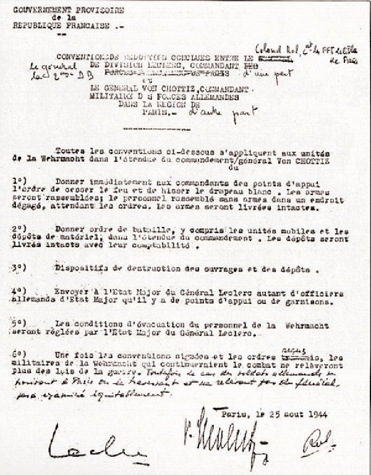 La unidad de Granell se interna por las calles de París, recibiendo esporádicos disparos de los alemanes, hasta que llegan a la Plaza del Ayuntamiento, a primeras horas de la noche, y toman posiciones. “Hemos llegado a París, manden refuerzos”, dice el mensaje que envían por radio a Leclerc. El teniente Granell se presenta a los líderes de la Resistencia, en la que militan también muchos exiliados españoles, y estrecha la mano de Georges Bidault y Chaban-Delmas, que llegarán a ser importantes políticos franceses. Y así toma posesión oficial de la ciudad de París. Las vecinas campanas de Notre Dame comienzan a voltear. Un bombero francés, burlando la vigilancia alemana, se encarama a la Torre Eiffel y despliega una gigantesca bandera francesa. La gente se echa a la calle, en un júbilo imprudente que todavía se cobra algunas vidas bajo los disparos de francotiradores alemanes. Cuando el capitán Dronne llega por fin al Cuartel General alemán, el gobernador Von Choltitz cree que la División Leclerc en pleno ha invadido la capital y se rinde sin condiciones a un cabo extremeño al que regalará su reloj de pulsera. Cien españoles han conquistado una capital de 6 millones de habitantes. Ni Hernán Cortés se atrevió a tanto.