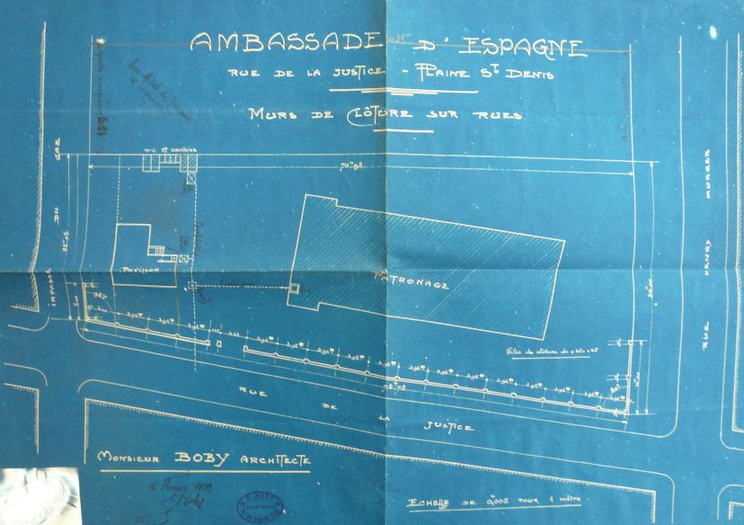 patronato », signifiant « œuvre sociale patronnée par un saint », indique que les domaines d’intervention des pères clarétains dépassent le seul cadre spirituel. Aussi, face à une chapelle construite en 1923 (A), se dressent un presbytère comportant un dispensaire médical (B), un bâtiment de service (D), et une salle de spectacle (C) sur laquelle s’appuie un fronton de pelote basque. L’ensemble permet ainsi d’offrir des aides, des soins, ainsi que des animations culturelles et sportives à la communauté espagnole, sous un étroit encadrement religieux garant de la fidélité des ressortissants au royaume d’Espagne. Le choix du maître d’œuvre, Eugène Boby