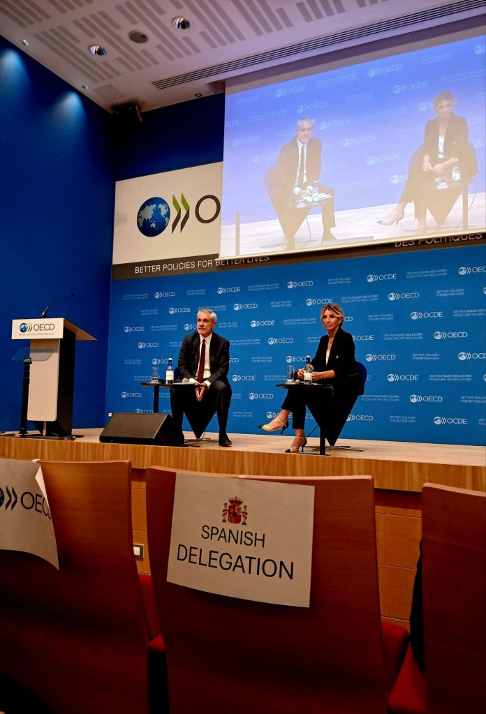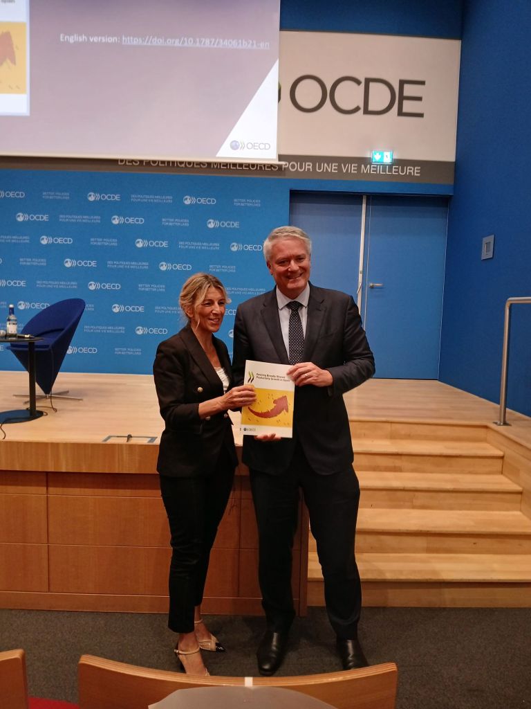 La vicepresidenta segunda y ministra de Trabajo y Economía Social, Yolanda Díaz, ha presentado hoy en la sede de la Organización para la Cooperación y el Desarrollo Económico (OCDE), en París, el informe Reactivar el crecimiento ampliamente compartido de la productividad en España que avala el impacto positivo de las políticas laborales implantadas en el país.Acompañada por el secretario general de la OCDE, Mathias Cormann, y el Director de Trabajo, Empleo y Asuntos Sociales de la OCDE, Stefano Scarpetta, la ministra ha explicado que el informe destaca que las medidas puestas en marcha en estos últimos años, en especial la reforma laboral y la subida sostenida del Salario Mínimo Interprofesional (SMI), han contribuido a mejorar el reparto de la productividad y reducir la desigualdad. Las políticas puestas en marcha por el Gobierno de España y el Ministerio de Trabajo y Economía Social “han tenido y van a seguir teniendo un impacto positivo en el reparto de las ganancias de la productividad. Están encaminadas a proteger el empleo y mejorar su calidad, incrementar los salarios y reducir la precariedad laboral”, ha insistido la vicepresidenta, quien ha querido puntualizar, además, que todo ello se ha conseguido con cifras récord de empleo en el país.