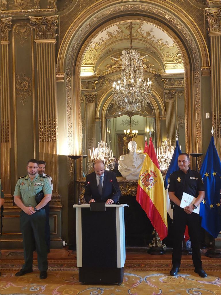El Embajador España, Victorio Redondo Baldrich recibió en la Embajada una representación del contingente de refuerzo de Policía Nacional y Guardia Civil que se ha desplazado a París para integrar el dispositivo de seguridad previsto por las autoridades francesas para los Juegos Olímpicos y los Juegos Paralímpicos. En el acto participaron una representación de los 313 policías nacionales y guardias civiles que conforman el contingente español. El Ministerio del Interior francés solicitó a 45 países que proporcionasen agentes de policía para garantizar la seguridad durante los Juegos Olímpicos y Paralímpicos, de los que la mayoría dieron una respuesta positiva. La delegación policial española es la más numerosa de cuantas se van a integrar en el dispositivo de seguridad que protegerá la competición olímpica. Tras la solicitud el pasado mes de enero de las autoridades francesas a España a través de su Embajada en Madrid, el Ministerio del Interior español dio de inmediato respuesta positiva y, desde entonces, se han sucedido las reuniones entre la Dirección de Cooperación Internacional para la Seguridad de la República Francesa y la Subdirección General de Cooperación Policial Internacional del Ministerio para perfilar las dimensiones del refuerzo español y las misiones que asumirán en la capital francesa. El refuerzo español para el dispositivo de seguridad de los Juegos Olímpicos y Paralímpicos de París está integrado por 171 policías nacionales, que pertenecen a unidades como Intervención Policial, Caballería, Brigada-Móvil, guías-caninos (especializados en explosivos), Unidad Central de Fronteras o los equipos anti-dron de la Unidad Aérea, entre otras. Por su parte, otros 142 guardias civiles se integrarán en este grupo, procedentes de unidades como Seguridad Ciudadana, Fiscal y de Fronteras, las academias de Valdemoro y Baeza, el Grupo de Acción Rápida, el Servicio de Desactivación de Explosivos (SEDEX-NRBQ), el Servicio Cinológico y la Agrupación de Tráfico, entre otras. De los integrantes de este contingente, cinco mandos de la Policía Nacional y seis de la Guardia Civil se integrarán en la Oficia de Coordinación Nacional para la Seguridad de los Juegos Olímpicos y Paralímpicos (CNSJ), creada por las autoridades francesas para facilitar la integración de los refuerzos internacionales desplegados para la seguridad de la competición deportiva este verano.