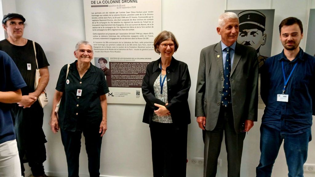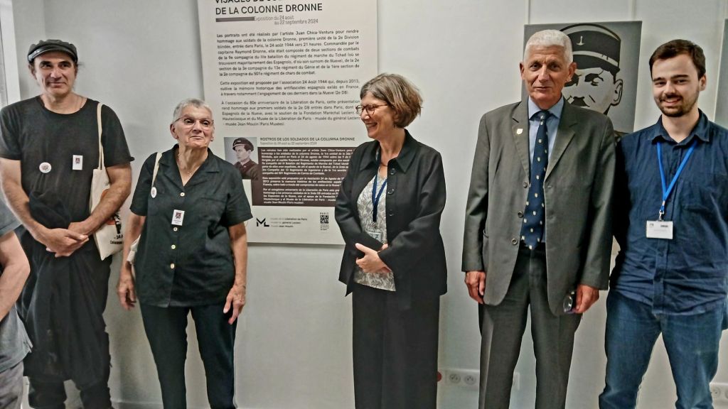 En la inauguración de la exposición de retratos de hombres de la Columna Dronne:Participaron Véronique Salou presidenta de la Asociación 24 Aout 1944,la Señora Sylvie Zaidman directora del Museo de la Liberación de París,El general Jean Paul MICHEL, nacido en 1952 en Sainte Hélène (Vosgos), es presidente de la Asociación de Veteranos de la 2.ª DB y presidente de la Fundación Maréchal Leclerc de Hauteclocque desde el 9 de mayo de 2020.El Autor de los retratos y miembro fundador de la asociación 24 Aout 1944 y también autor del mural homenaje a La Nueve, rue Esquirol, París 13 Juan Chica Ventura