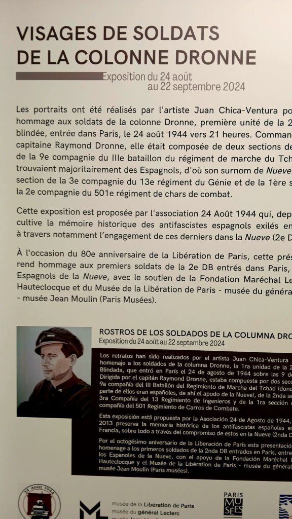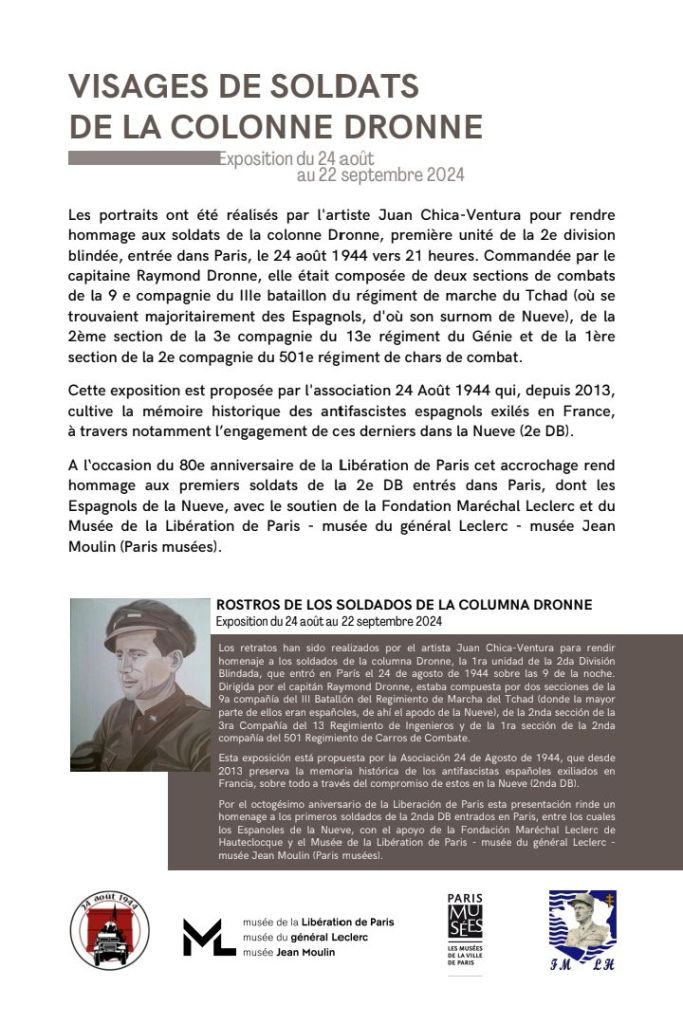 En el Museo de la Liberación de París tuvo lugar jueves 22 de Agosto la inauguración de una exposición en homenaje a los hombres de la columna Dronne,que representa 15 retratos de hombres que formaban parte de la Novena Compañía realizada por Chico Ventura y organizada por la Asociación 24 Aout 1944