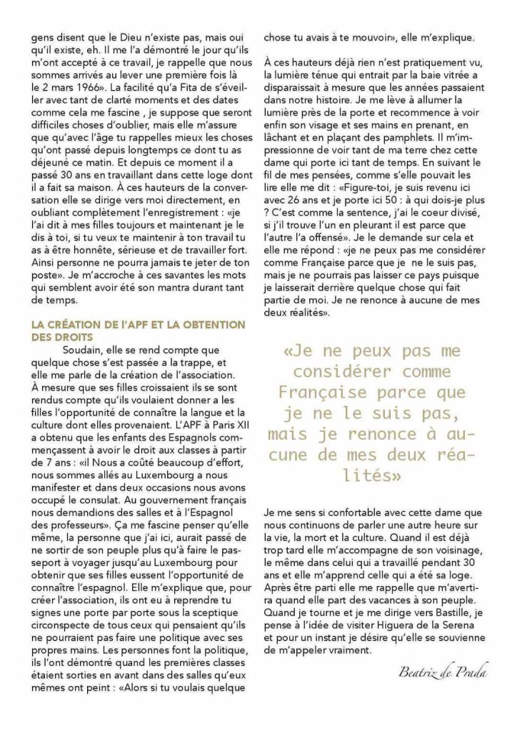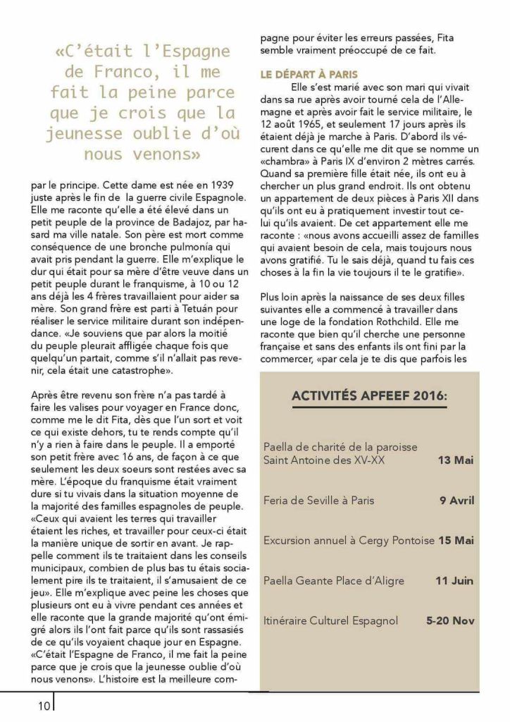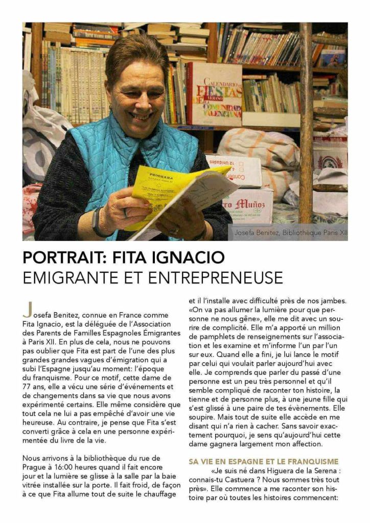 Fita Presidenta de la Asociación de Padres de Familias Emigrantes en Francia (APFEEF) una de las asociaciones españolas de París culturalmente más activa, desde 1973 y hasta ahora,