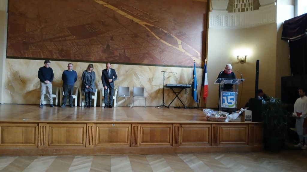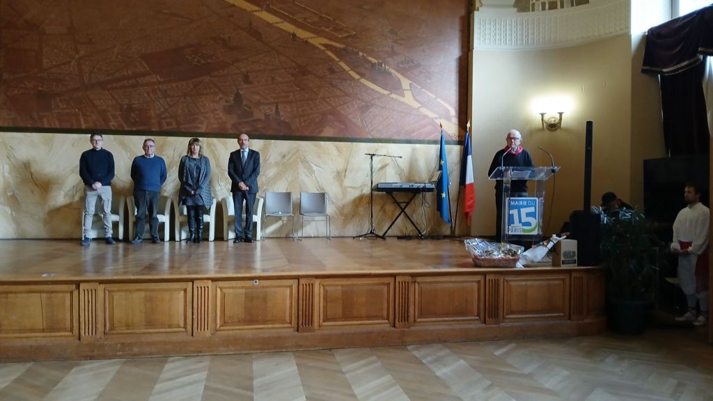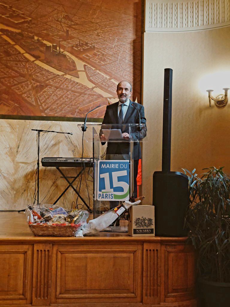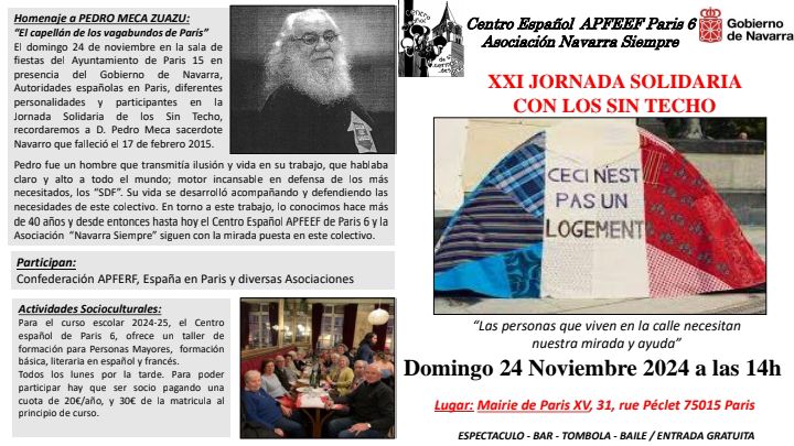 El 24 de noviembre en el Ayuntamiento de Paris 15ème tuvo lugar la XXI Jornada de Solidaridad con los Sin Techo Homenaje a Pedro Meca en presencia del embajador de España en Francia Sr. Victorio Redondo Baldrich,la Consejera de Relaciones Internacionales del Gobierno de Navarra Dña. Ana Ollo Hualde,Sr.Jesus Martínez Dorronsero Director de la Uned, Consejero de Trabajo en Francia Sr.Daniel Solana,Director Colegio de España Ciudad Universitaria Sr. Justo Zambrana,Presidente de las Asociaciones,Navarra Siempre y Centro Español APFEEF Paris 6eme Sr.Jose Maria Oliver organizadores de esta jornada