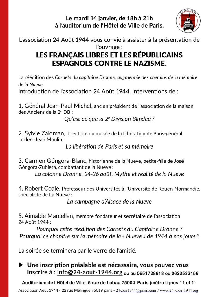 Recordemos que se trata de la reedición de los diarios de guerra del capitán Raymond Dronne, “un francés libre” desde el principio (junio de 1940). Comandó la 9ª Compañía del 3er Batallón del Regimiento de la Marcha del Chad, 2ª División Blindada. Su compañía se llamó «La Nueve porque estaba compuesta principalmente por republicanos españoles exiliados.