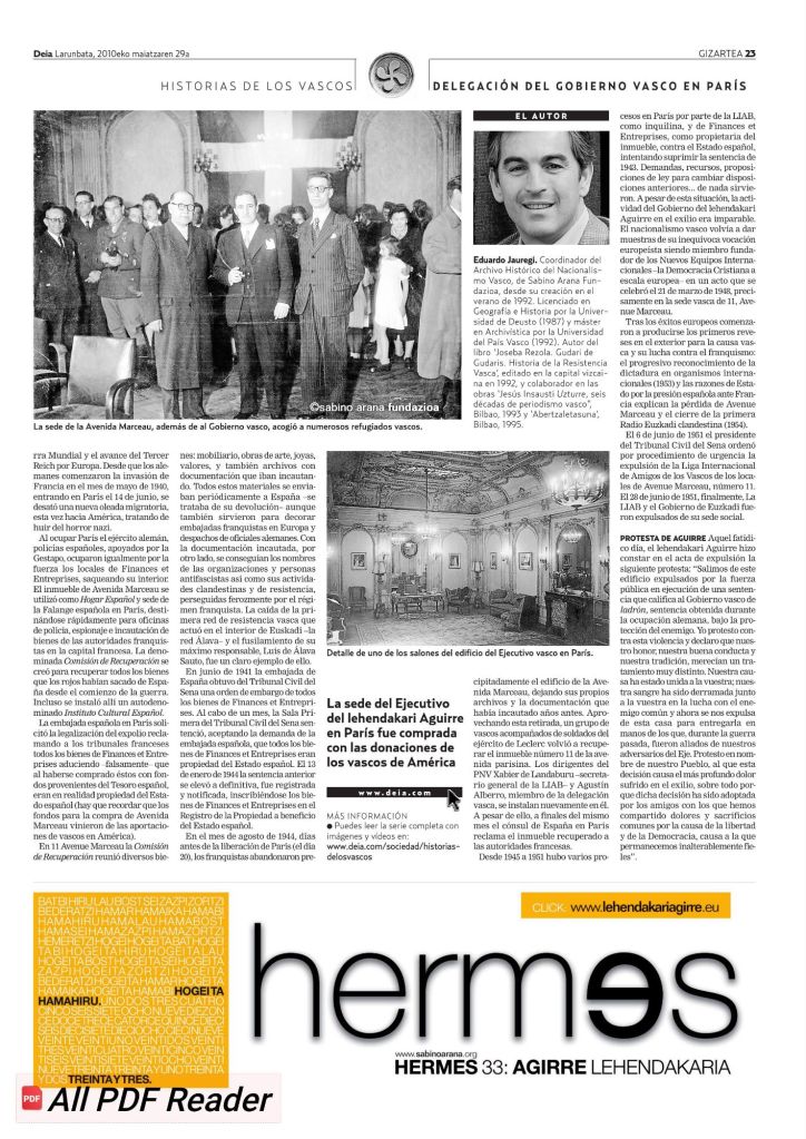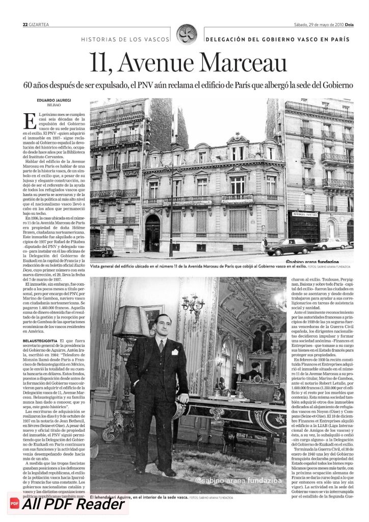 El 11 avenida Marceau no dejó de ser el referente de ayuda a todos los refugiados vascos, que a esta puerta se acercaron y de la gestión de la política al más alto nivel que el nacionalismo vasco llevó a cabo en los años que permaneció bajo su techo En 1936 el edificio en el número once de la avenida Marceau de París era propiedad de Doña Elena Brown ciudadana norteamericana este inmueble fue alquilado a principios de mil novecientos treinta y siete por Rafel de Pikabea diputado del Partido nacionallista Vasco y delegado Vasco para instalar en las oficinas del gobierno la oficina de la Delegación del Gobierno de Euzkadi en la capital de Francia y la redacción de su boletín oficial Euzko Deya cuyo primer número como esta nueva dirección lleva la fecha de 7 de marzo de 1937