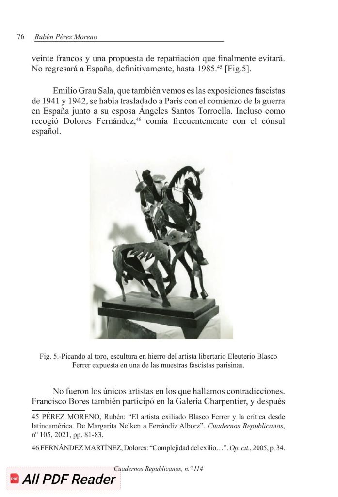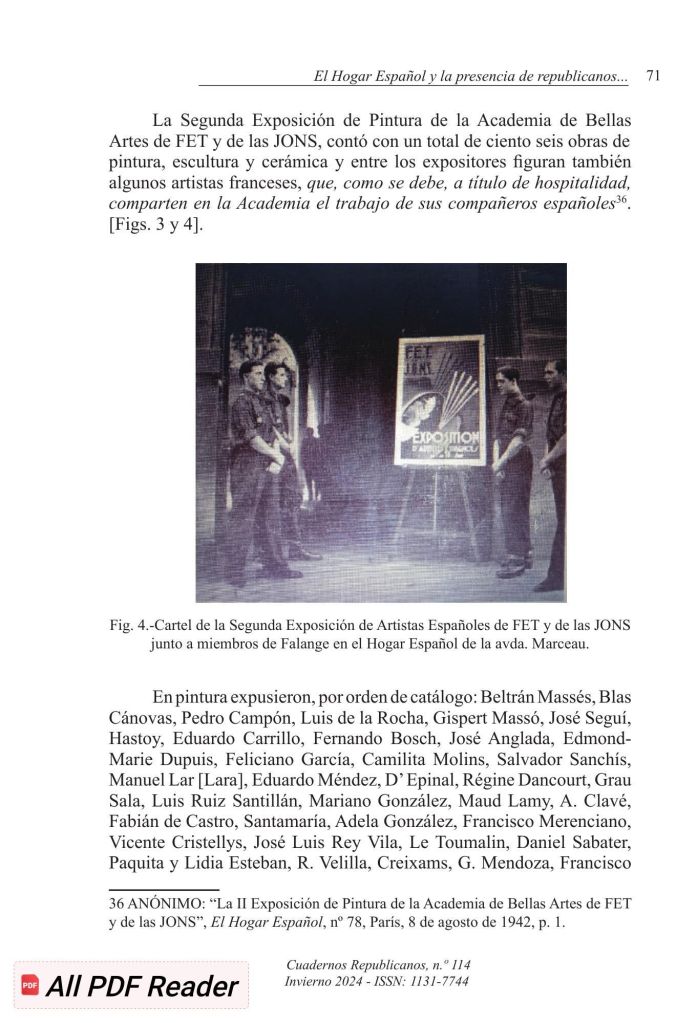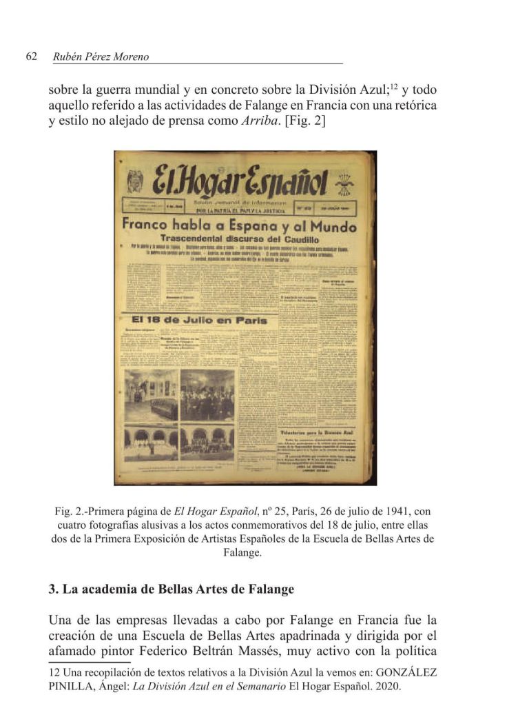 En 1941 se crearon en este Edificio del 11 avenida Marceau la Sede del Hogar español,sede de FETy de las Jons de La Falange, en Francia una Academia de Bellas Artes auspiciada por el pintor Federico Beltrán Masses.Estas organizó tres exposiciones en la que hallamos a varios artistas españoles exiliados y otros que residentes ya en París se habían identificado abiertamente con la causa republicana.Estas notas abordan dichas muestras y las paradojas y contradicciones de dichos creadores en un contexto de miedo persecución y mera supervivencia en tiempos de la ocupación alemana
