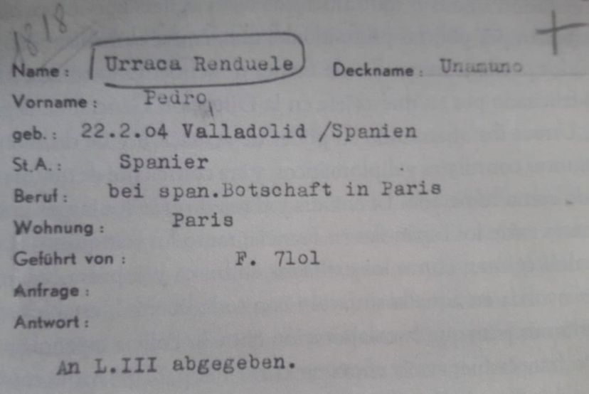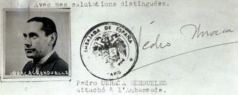 ( la entrada de los alemanes en París la policía española de la Embajada protegida por la Gestapo ocupó inmediatamente los locales de 11, Avenue Marceau y la sede de “Finances et Entreprisas” en Pierre 1º de Levie, 33. Fueron colocados en la puerta sellos de la Gestapo y los de la policía española con colores españoles. En nombre de la Embajada española sus funcionarios Pedro Urraca Rendueles,(Apodado “el cazador de rojos”, fue fundamental para el triángulo formado por Franco, Petàin y Hitler. Persiguió, dio caza y expolió a números españoles antifranquistas. oscuro policía franquista condenado a muerte en rebeldía en Francia (1948) por connivencia con el enemigo durante la ocupación. Huido a Bélgica, siguió trabajando para el Estado español hasta 1982)