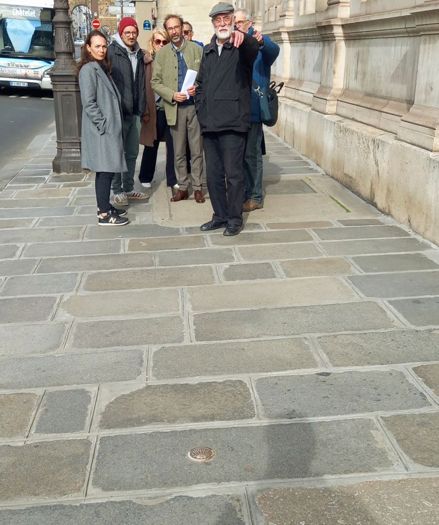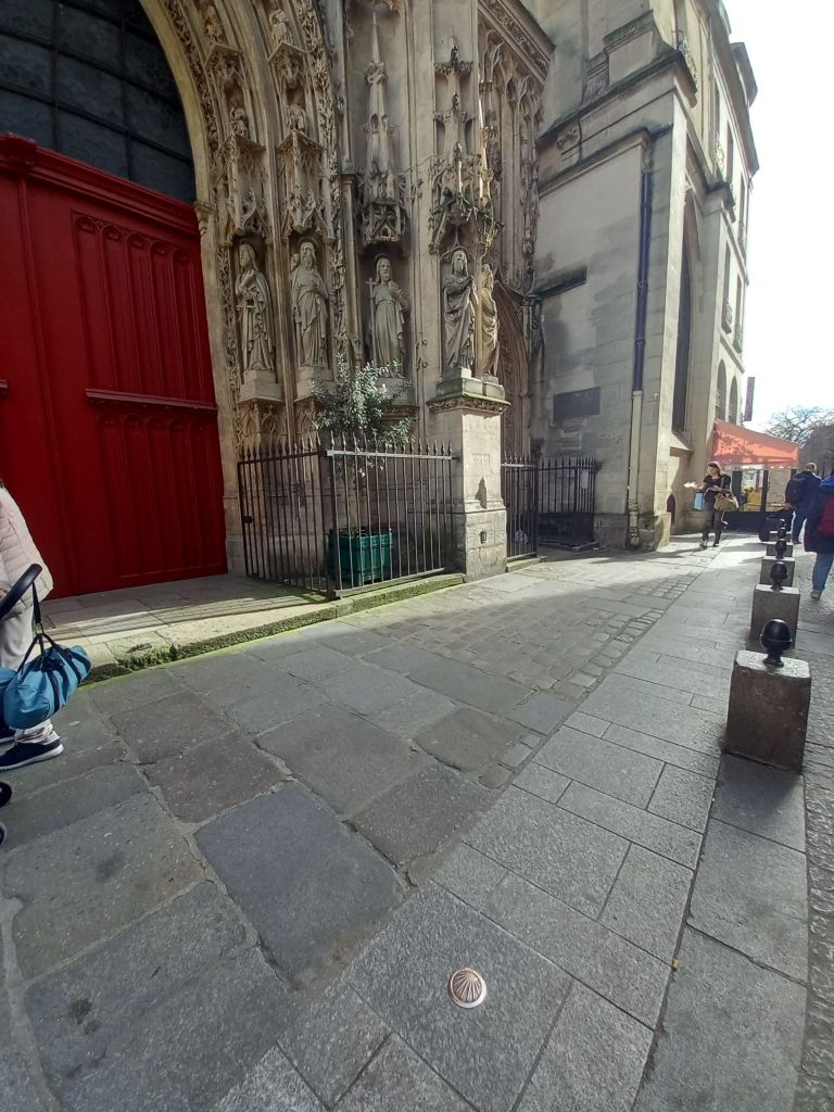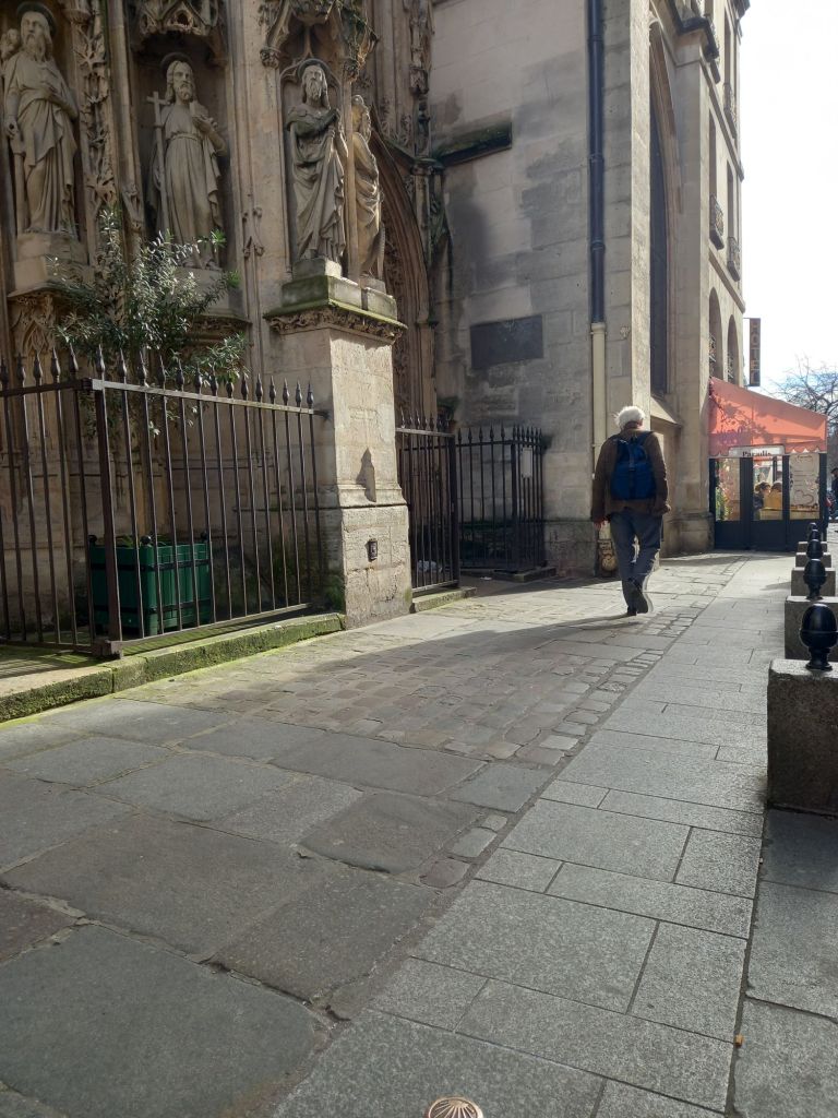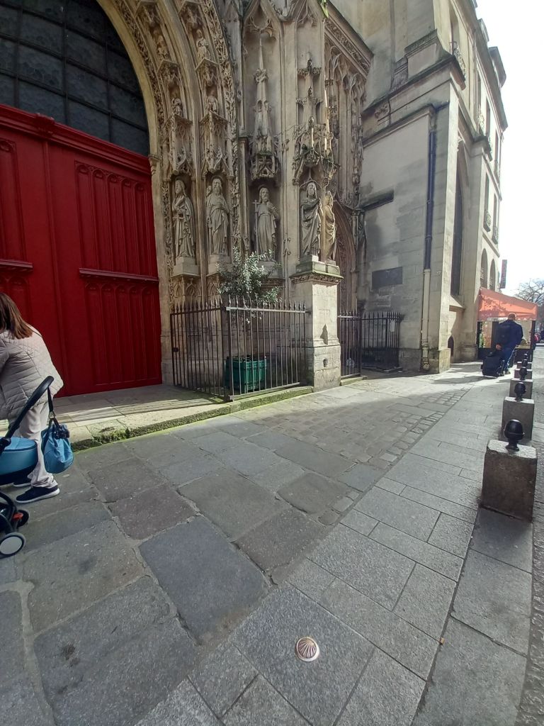 En 2020 , 70 clavos de concha marcan el Camino de Santiago a lo largo de la calle Petit-Pont y la calle Saint-Jacques.