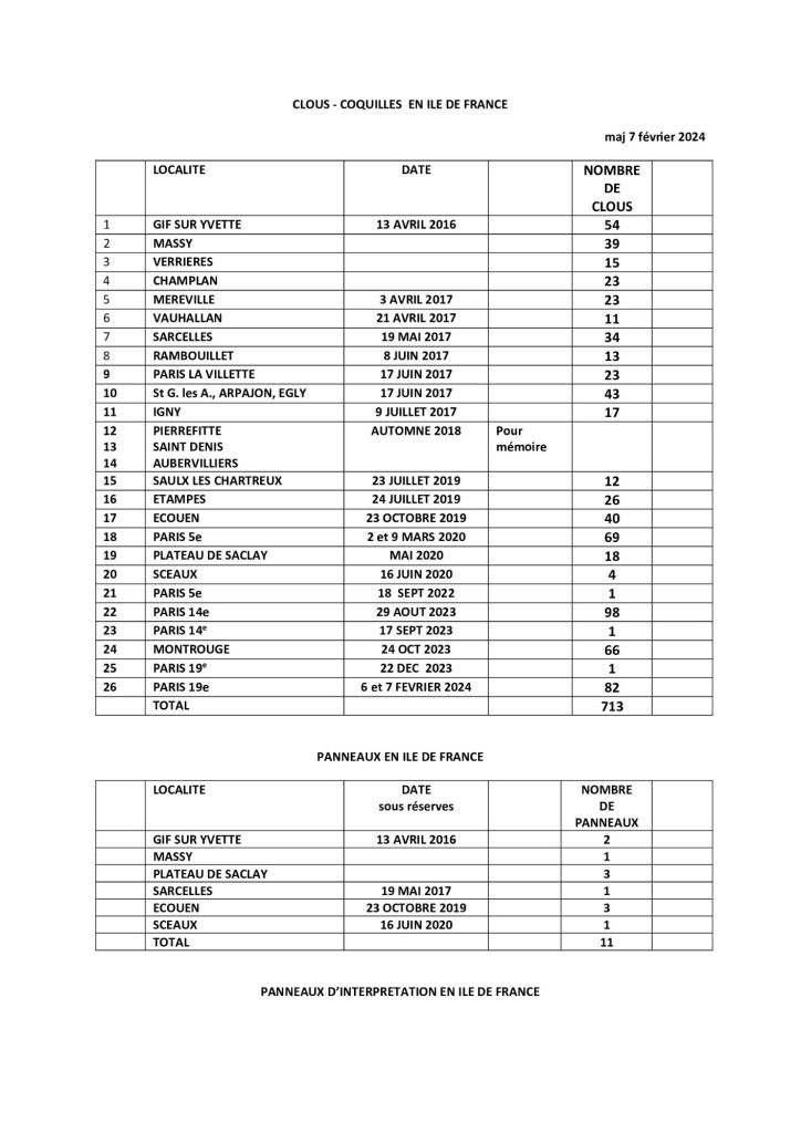 El primer clavo de concha de la región de Île-de-France se colocó en 2012 en Massy, delante de la oficina de turismo. En 2016, la ciudad de Massy contaba con una veintena de ellas instaladas, seguida de Gif-sur-Yvette y Verrières-le-Buisson.