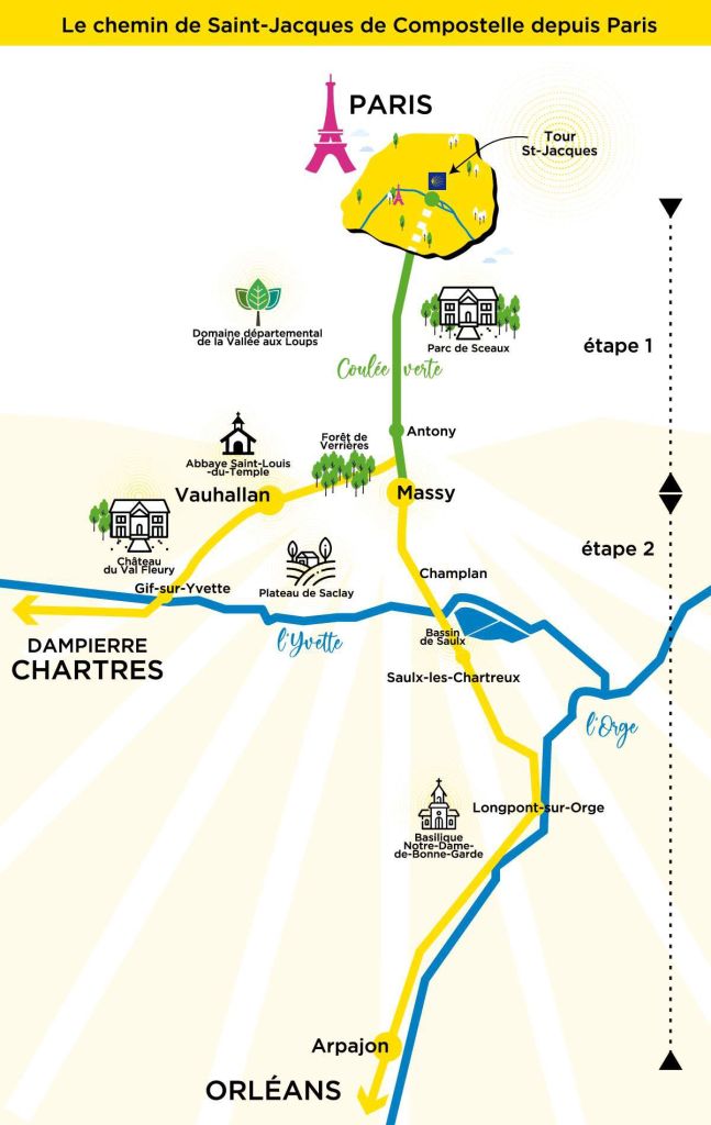 Au départ de Paris, la première étape du chemin de Saint-Jacques de Compostelle traverse l’agglomération Paris-Saclay. En effet, après la coulée verte (voie des vallons de la bièvre) le marcheur aura le plaisir de déambuler vers Chartres ou Orléans.