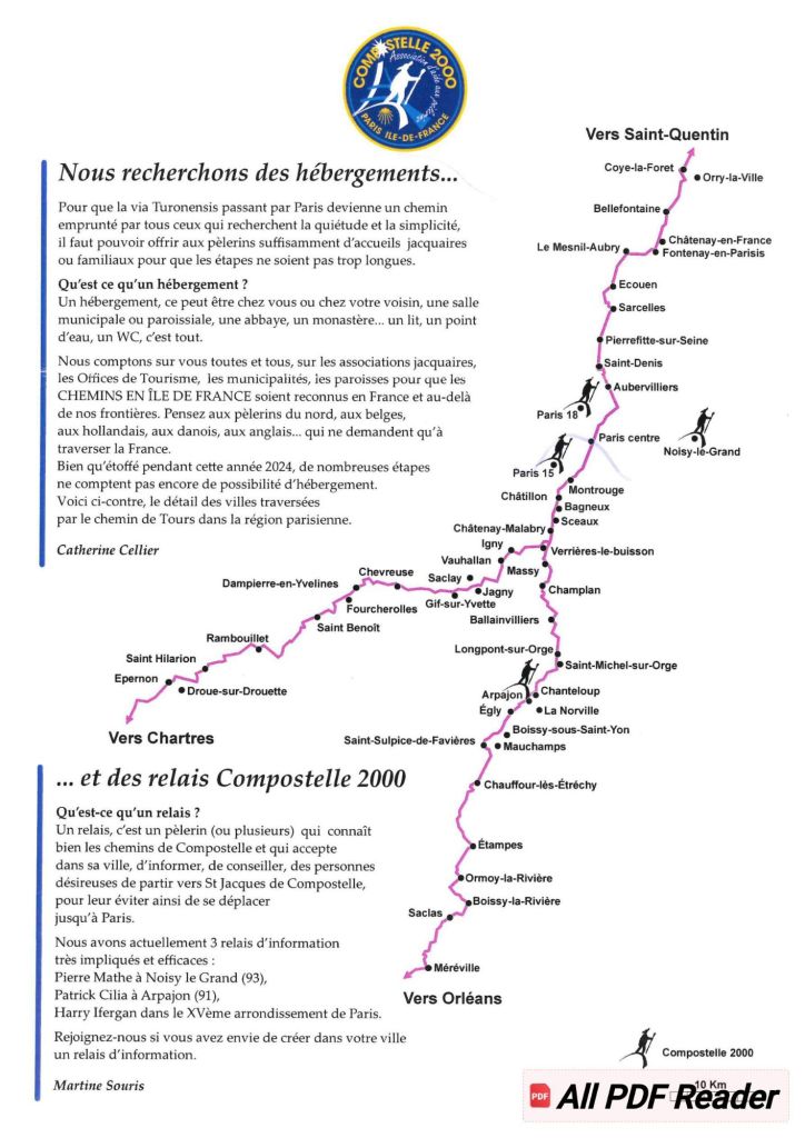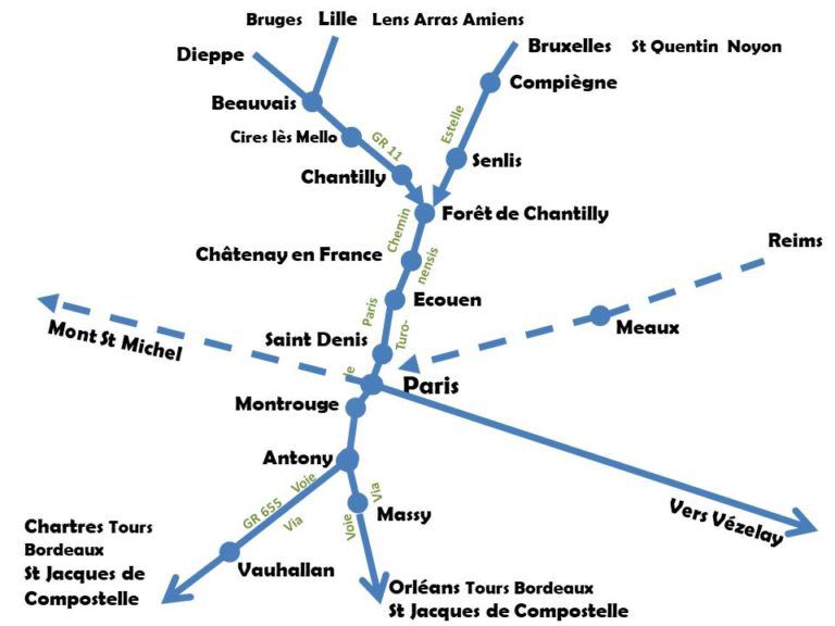 El camino que atraviesa París, viniendo del Norte para unirse a la Vía Turonensis (Carretera de Tours), está señalizado por los miembros de Compostelle 2000, en colaboración con nuestros amigos de otras asociaciones de Oise, Loiret y Eure-et-Loir y en colaboración con las autoridades locales.