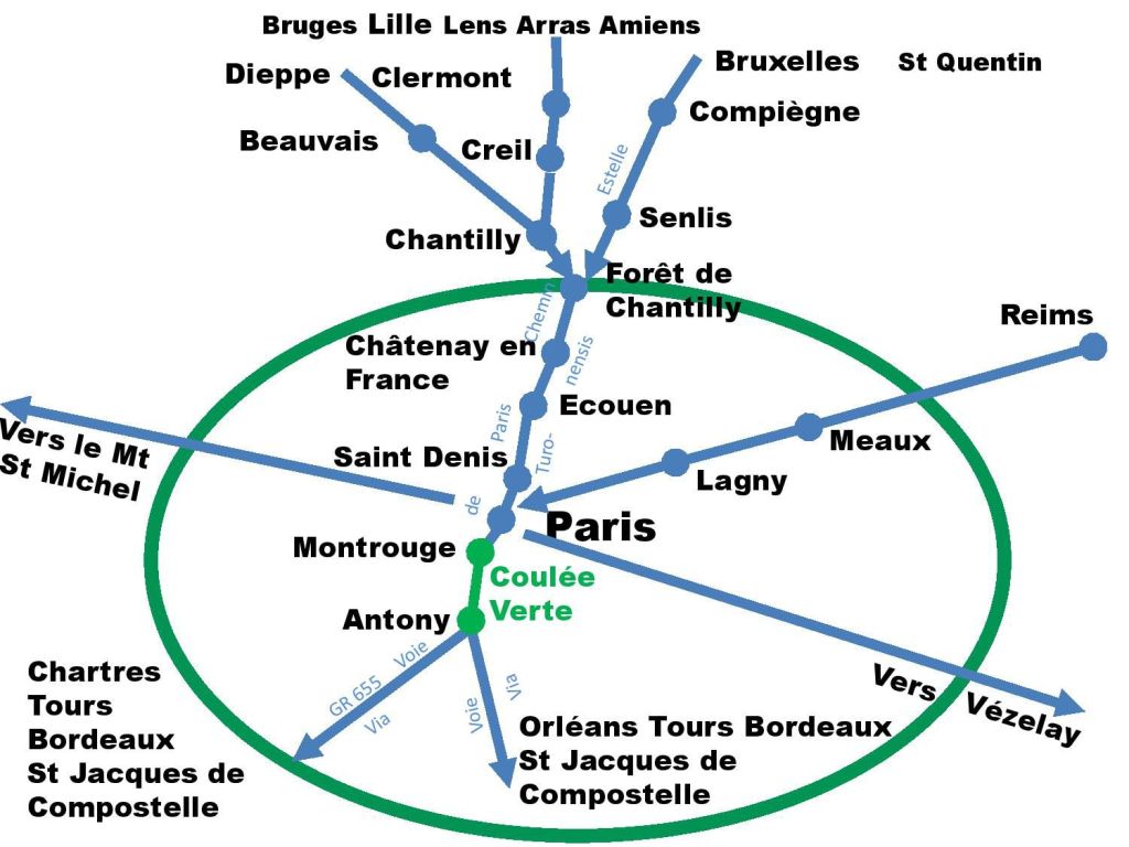 París forma parte de uno de los cuatro itinerarios históricos del Camino Francés, el más antiguo y emblemático. Ya en 1135, el Códice Calixtino mencionaba la ruta París-Tours, que junto con las rutas de Vézelay-Limoges y Le Puy-Conques, accede a España por Roncesvalles. El cuarto itinerario francés es el de Arlés-Toulouse, que entra por el puerto de Somport y se une a los anteriores en Puente la Reina (Navarra).