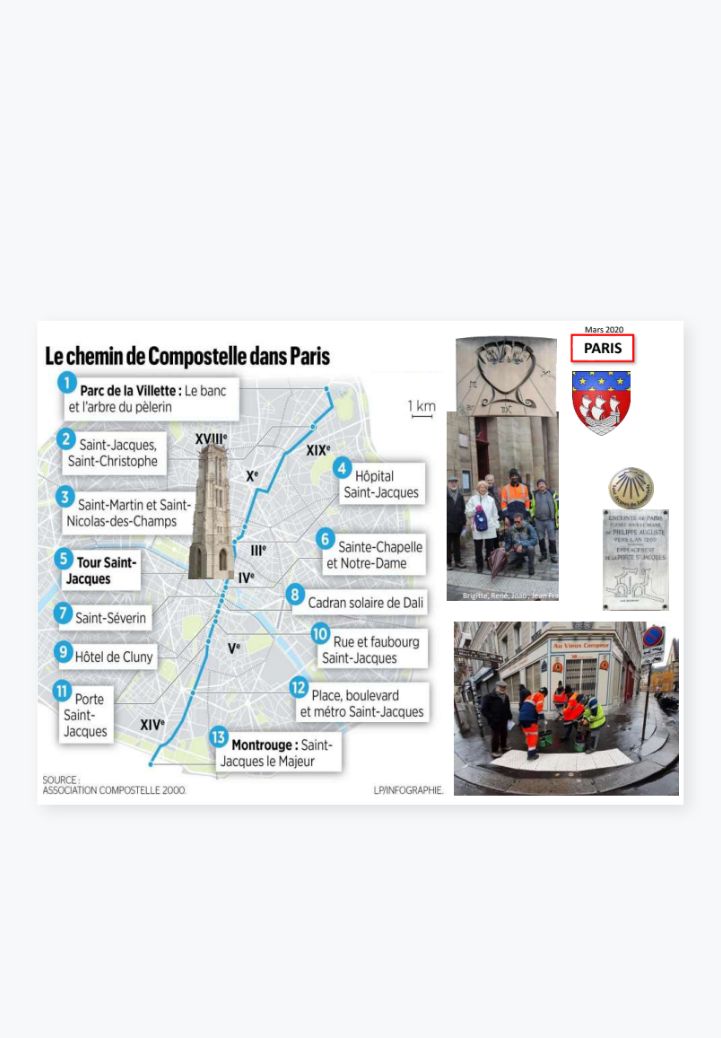 Paris fait partie de l’un des quatre itinéraires français du Chemin Français, l’itinéraire jacquaire le plus ancien et le plus emblématique. Les premières références datent de 1135 dans le Codex Calixtinus. Cette œuvre mentionne déjà l’itinéraire Paris-Tours, qui, avec ceux de Vézelay-Limoges et Le Puy-Conques, entre en Espagne par Roncevaux. Le quatrième itinéraire est celui d’Arles-Toulouse, qui entre par le col du Somport et rejoint les autres à Puente la Reina (Navarre)