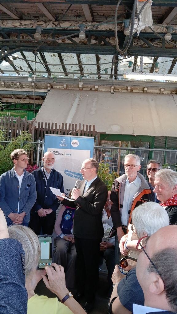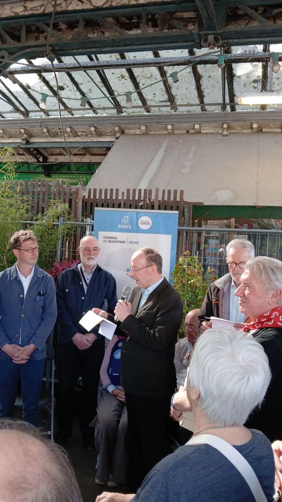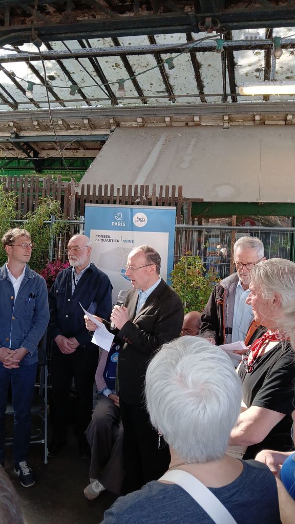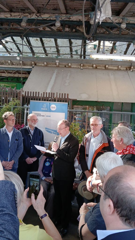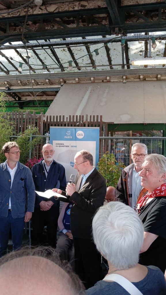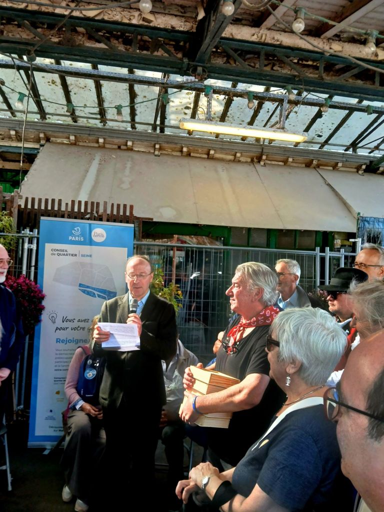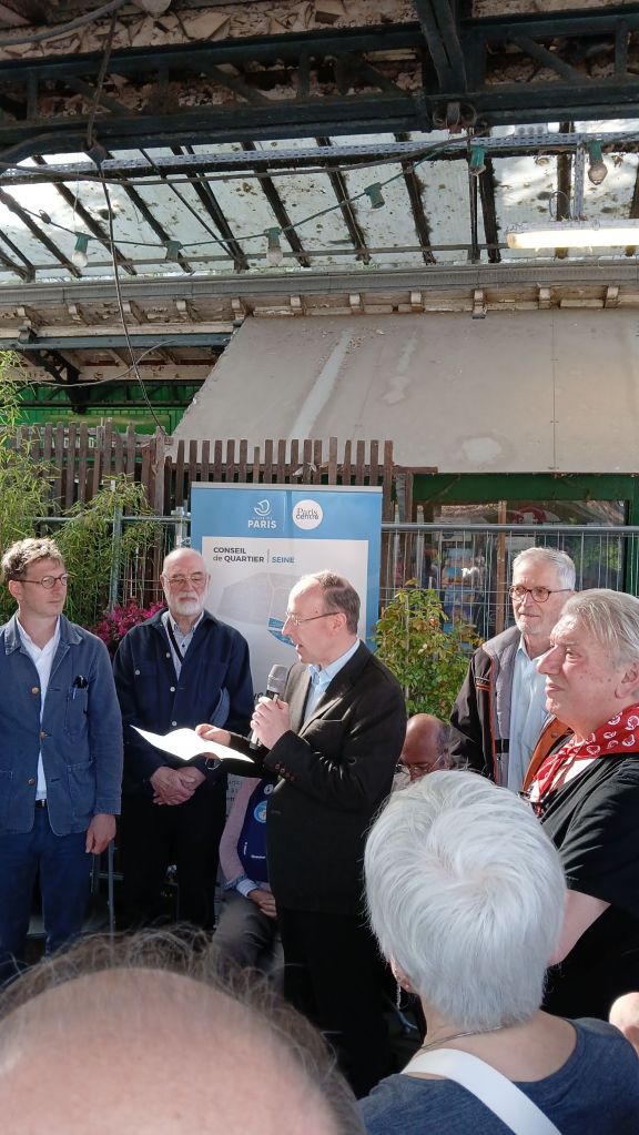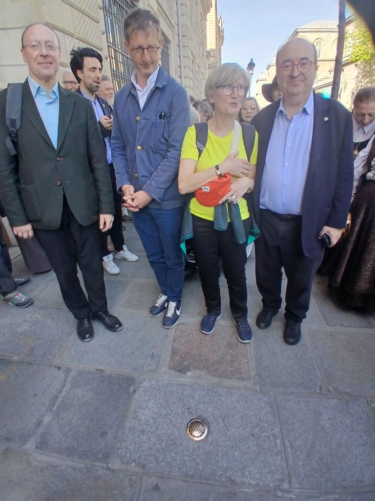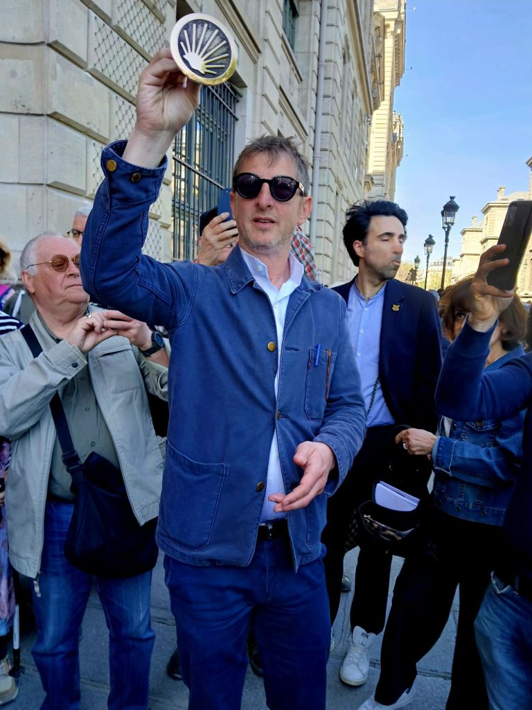 presencia del embajador de España ante la UNESCO, Sr. Miguel Iceta, y diversas autoridades locales, en un evento celebrado en el cercano Mercado de las Flores y los Pájaros. A 150 metros de la Catedral Notre-Dame La iniciativa fue promovida por la asociación francesa Compostelle 2000, presidida por Martine Souris. Desde hace más de 20 años, esta organización ha instalado conchas para guiar a los peregrinos hacia Compostela. En esta ocasión, el acto fue presentado por Jean-François Fejoz, junto al equipo de señalización del Camino de Santiago en París y su región: Brigitte Collignon, René Deleval, Joao Gonçalves, Eduardo Cuña, y el propio Fejoz, todos miembros activos de Compostelle 2000, con 17 años de labor continua en pro de la visibilidad del Camino en Île-de-France.