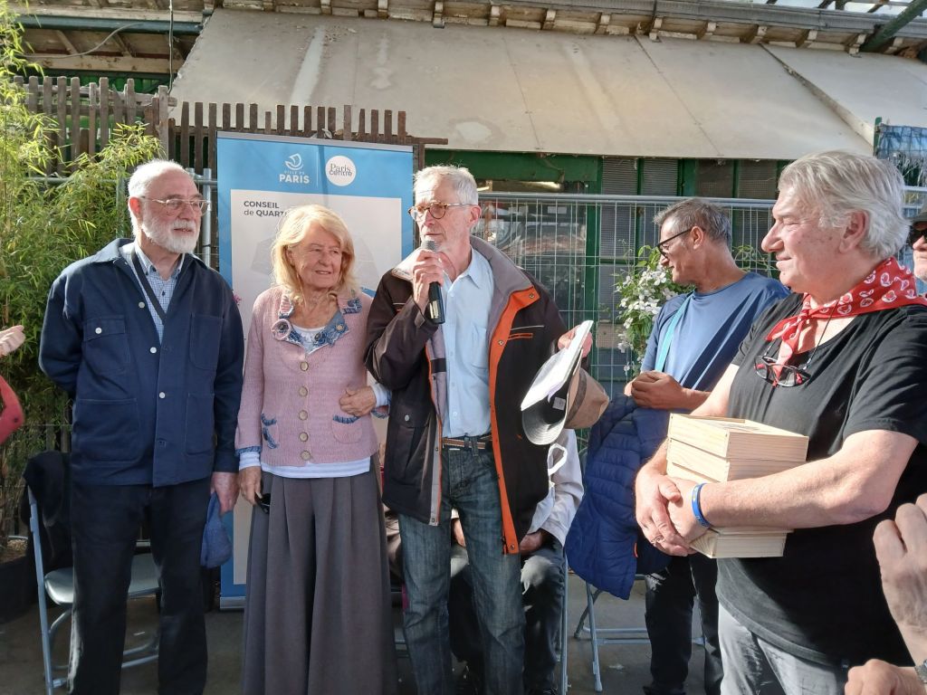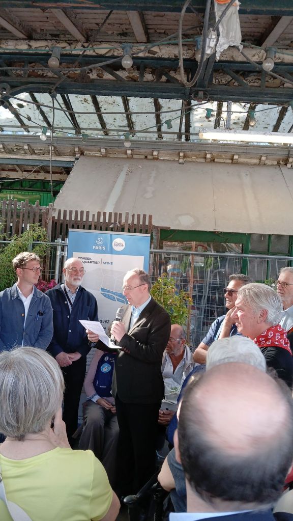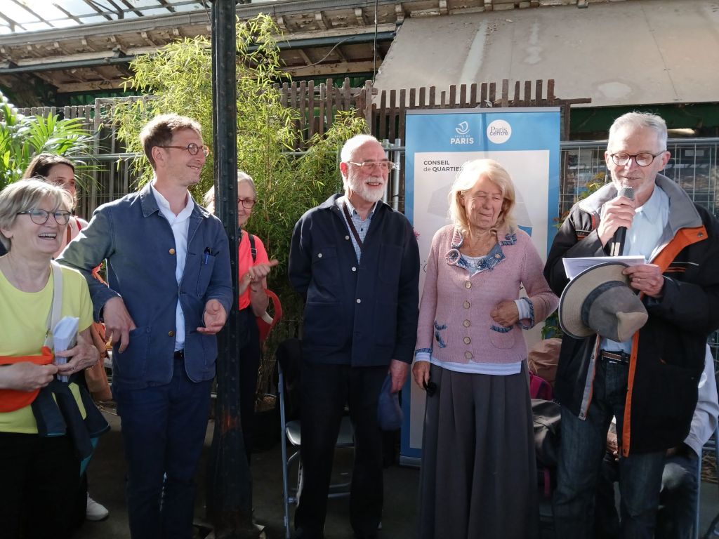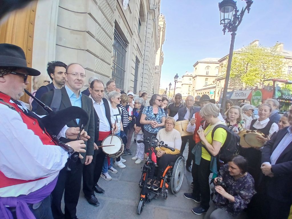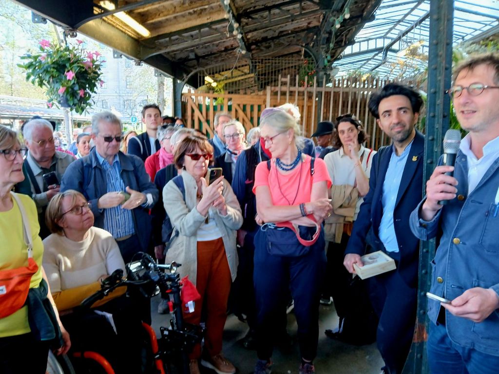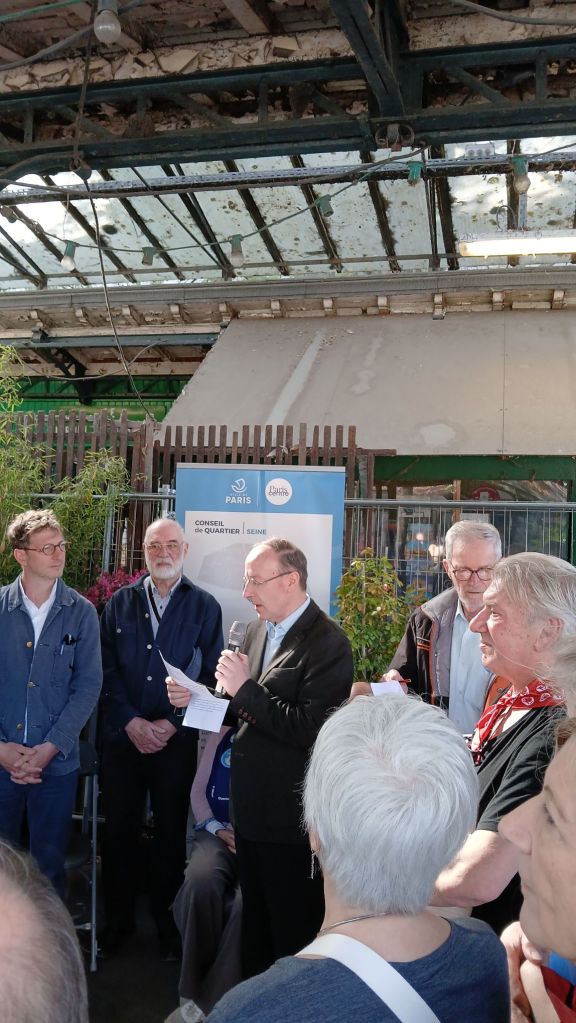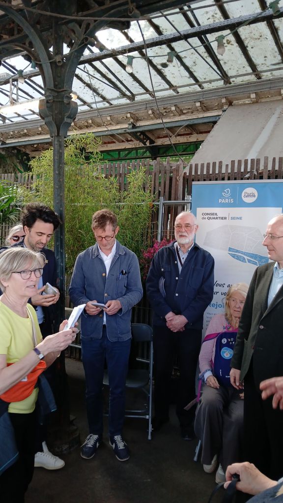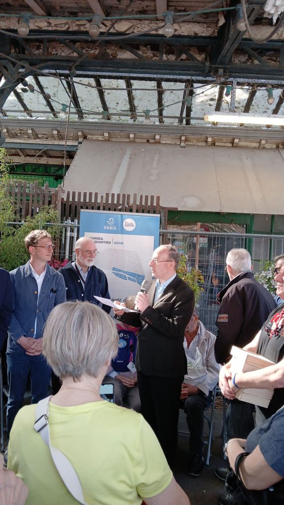 presencia del embajador de España ante la UNESCO, Sr. Miguel Iceta, y diversas autoridades locales, en un evento celebrado en el cercano Mercado de las Flores y los Pájaros. A 150 metros de la Catedral Notre-Dame La iniciativa fue promovida por la asociación francesa Compostelle 2000, presidida por Martine Souris. Desde hace más de 20 años, esta organización ha instalado conchas para guiar a los peregrinos hacia Compostela. En esta ocasión, el acto fue presentado por Jean-François Fejoz, junto al equipo de señalización del Camino de Santiago en París y su región: Brigitte Collignon, René Deleval, Joao Gonçalves, Eduardo Cuña, y el propio Fejoz, todos miembros activos de Compostelle 2000, con 17 años de labor continua en pro de la visibilidad del Camino en Île-de-France.