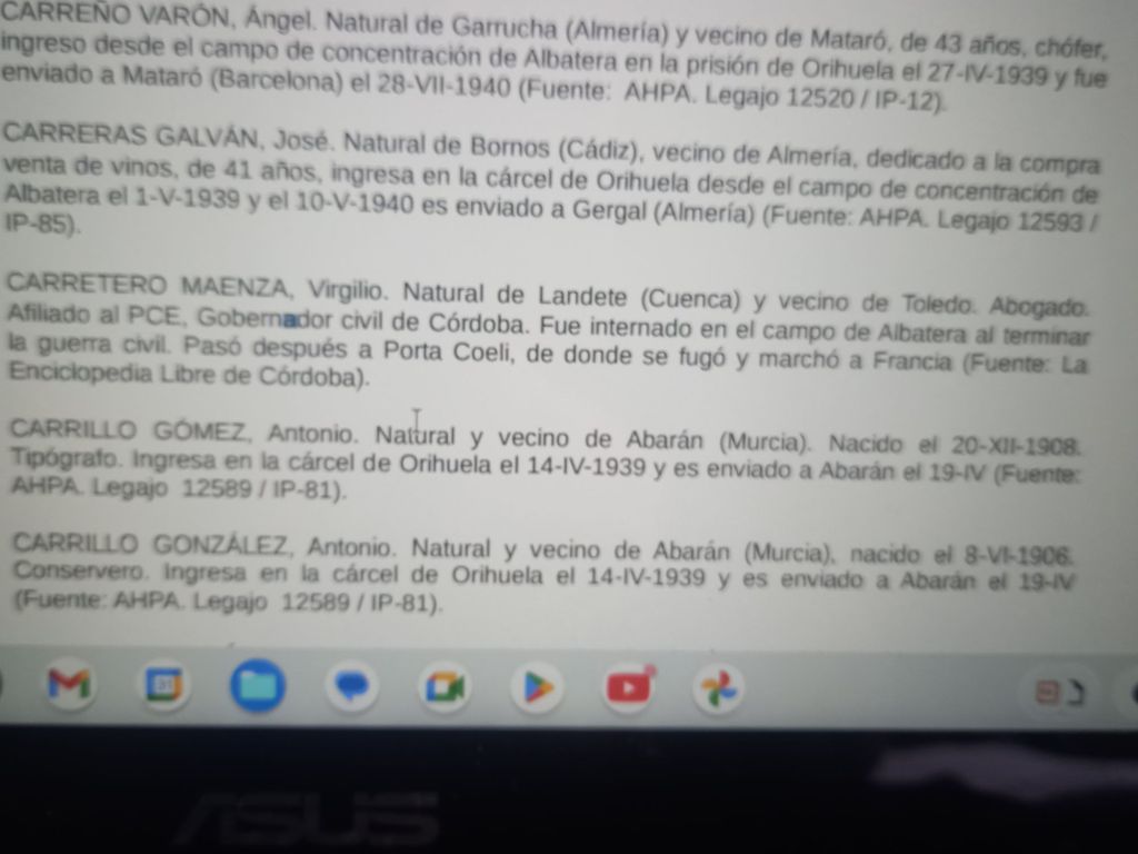 pero mis tíos si estuvieron varios años en la cárcel, con pena de muerte, que por cierto, mi tío,uno de los tres hermanos, se murió del corazón, porque todos los, días, todos los días durante dos años,el régimen de Franco ha asesinado a mucha gente. Él, todos los días tenia la patrulla,tocando a su celda pum, pum, pum, eso sí que me lo ha contado mi tio. Él me lo ha contado cuando yo iba a la cárcel a verle.