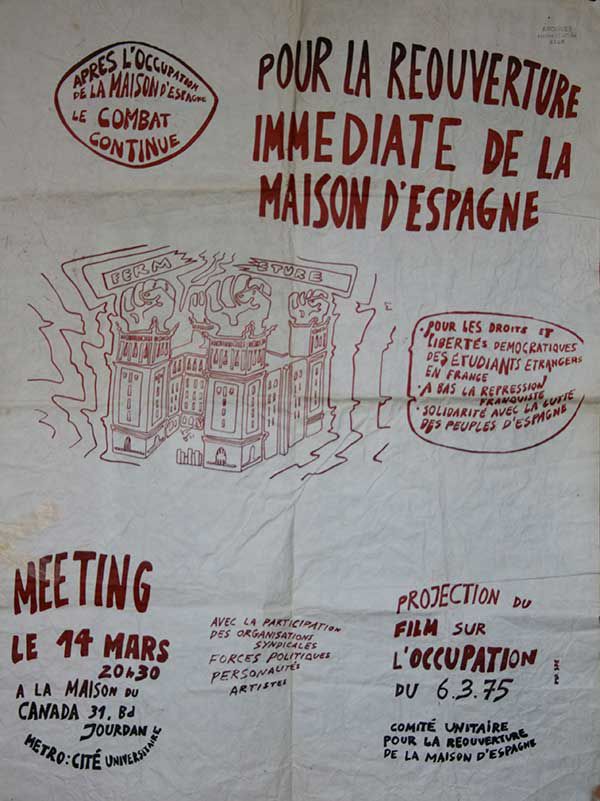 A raíz de los acontecimientos de Mayo del 68, el Colegio de España es ocupado por un grupo de “elementos revolucionarios”, que después de una asamblea de varias horas constituyen un Comité de ocupación que decide sustituir a la administración del Colegio. Los manifestantes son desalojados por la policía un mes más tarde. El Gobierno español decide trasladar a los residentes a otras casas de la Cité y cerrar el Colegio bajo pretexto de llevar a cabo unas obras de reforma.