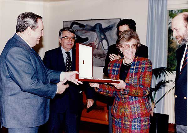 Los Reyes de España, Don Juan Carlos y Doña Sofía, y el Presidente de la República Francesa, François Mitterrand, acompañados del citado Ministro de Educación y Ciencia español, José María Maravall, de la Secretaria de Estado del Ministerio de Educación Nacional de Francia, Michèle Alliot-Marie, y del Embajador de España en París, Juan Durán-Loriga, inauguran la segunda etapa del Colegio de España en París el 16 de octubre de 1987. La directora del Colegio, Carmina Virgili, entrega a los dos jefes de Estado una medalla conmemorativa, realizada por el escultor vasco Jorge Oteiza.
