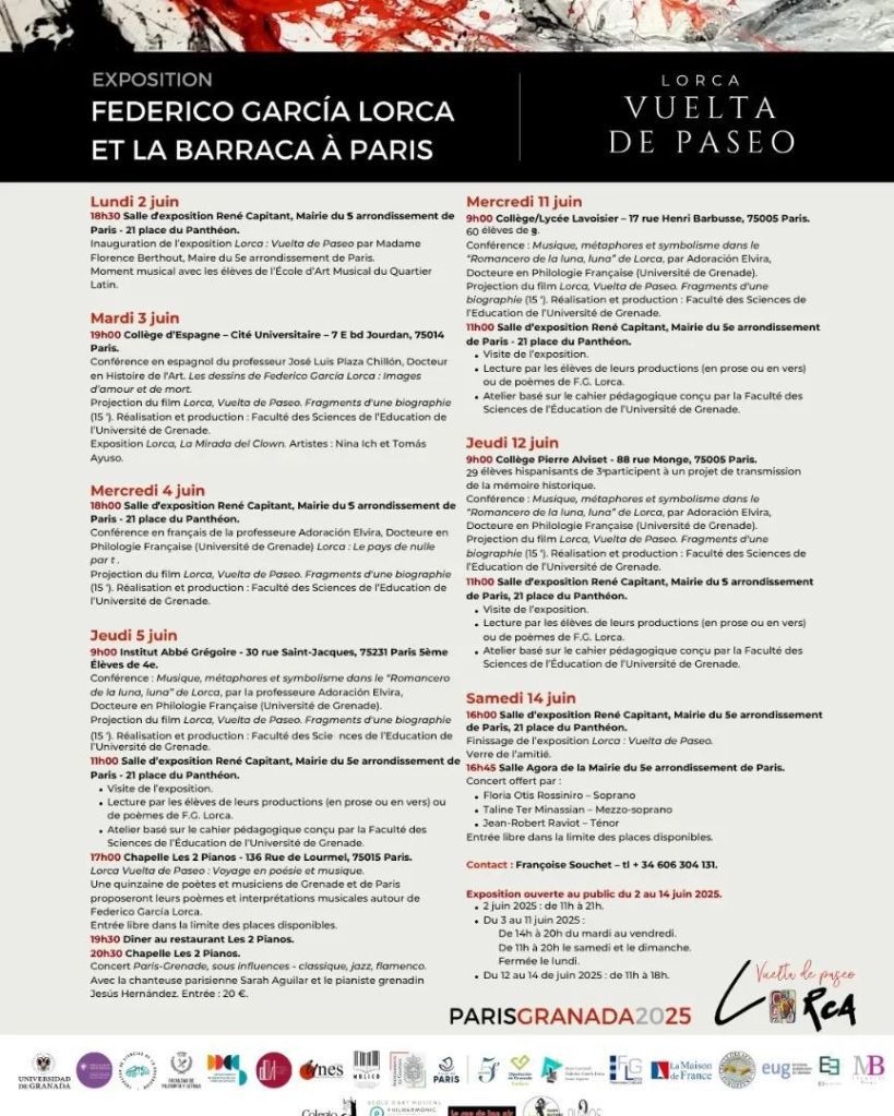 Bajo el título Lorca Vuelta de Paseo y La Barraca en París 2025, esta muestra rinde homenaje al poeta granadino a través de una programación multidisciplinar: pintura, escultura, fotografía, así como conferencias, encuentros poéticos y conciertos.