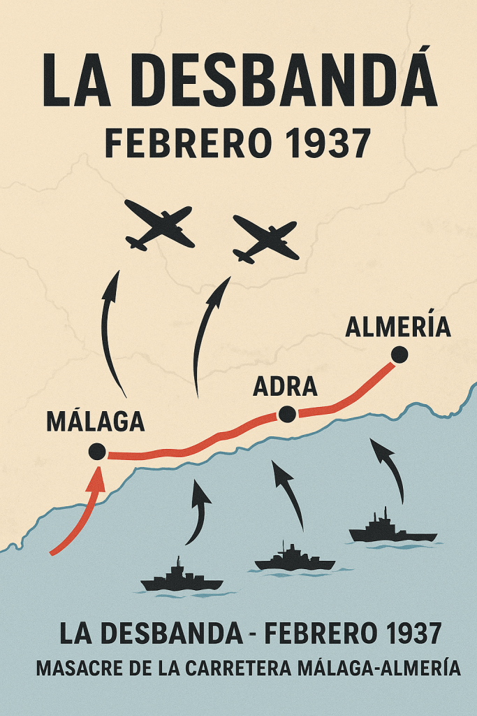 Finalmente, el 7 de febrero de 1937 se produce ‘La Desbandá’ o ‘La Huía’, el gran éxodo de la población civil desde Málaga hacia Almería, concentrándose, al menos, 120.000 personas. A lo anterior se uniría después una cantidad ingente de población en la Axarquía malagueña y de la costa de Granada, llegando, según los expertos, a la cifra de 200.000 personas a lo largo del trayecto (los datos de las últimas investigaciones elevan la cifra a 300.000). bombardeos y ataques sistemáticos sobre la caravana de 200.000 personas que huía hacia Almería.