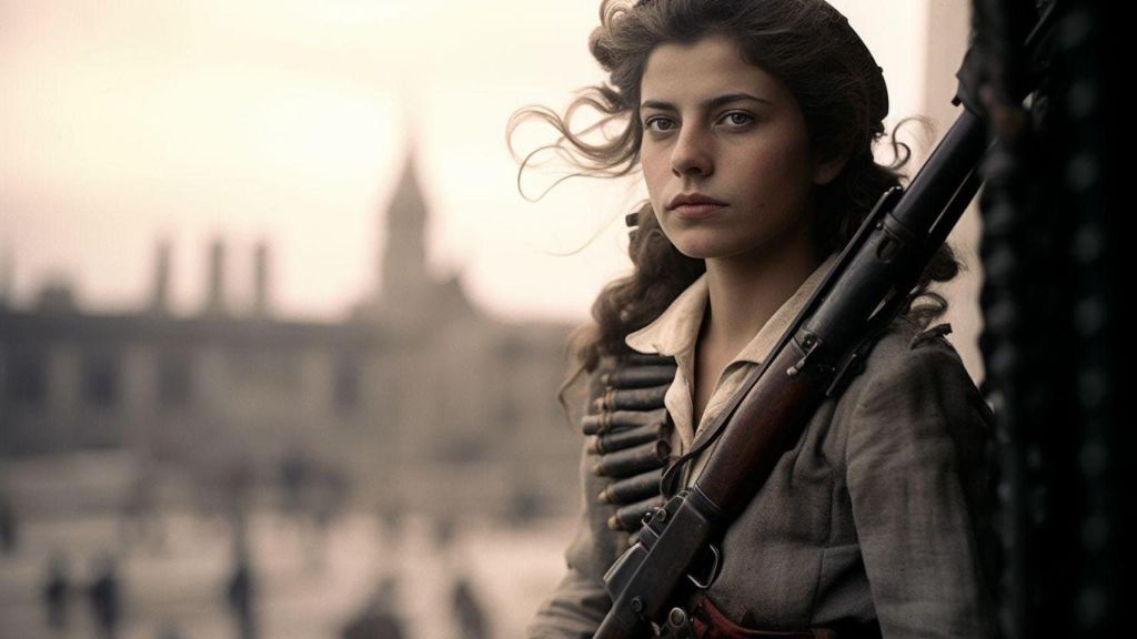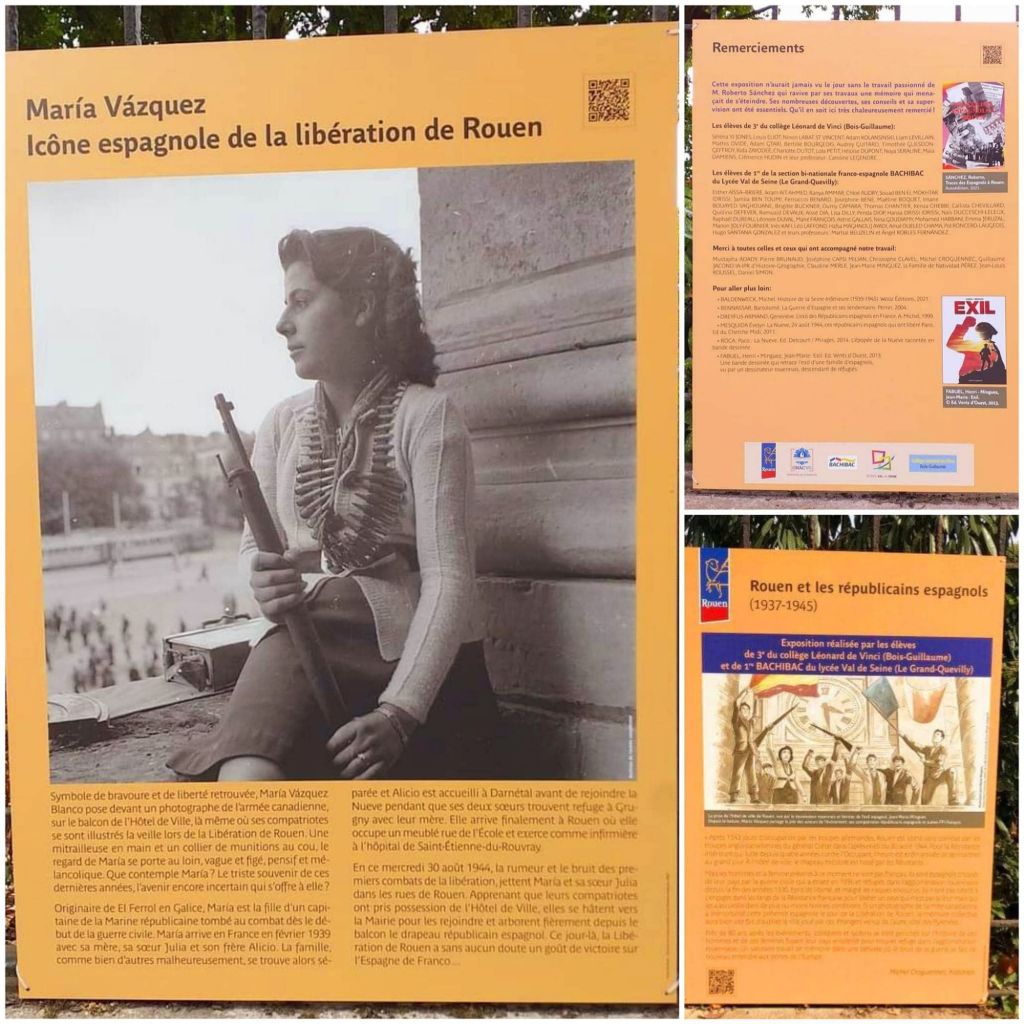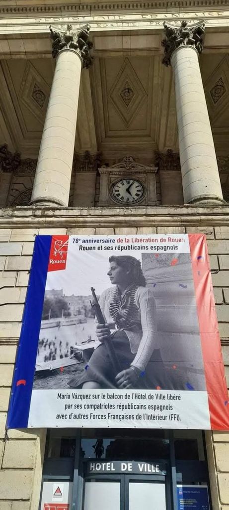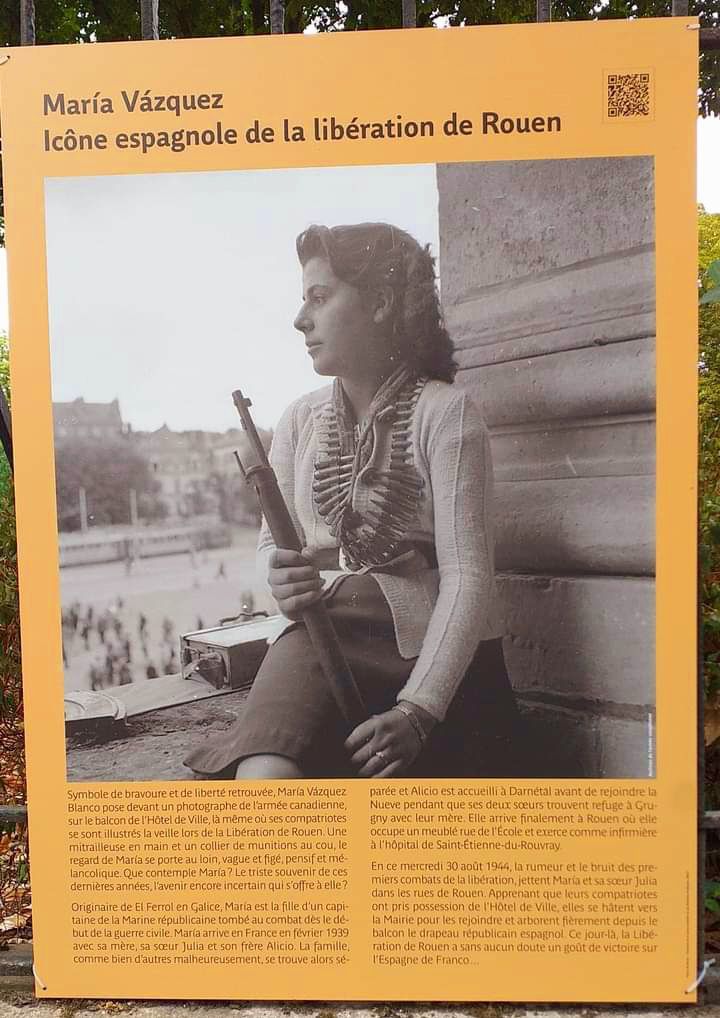 Fue entonces cuando el fotógrafo canadiense Ken Bell captó la célebre imagen: María Vázquez Blanco, en el balcón del Hôtel de Ville de Ruan, con un fusil Mauser en las manos y cartuchos de munición cruzados como adorno en el cuello. Una joven gallega, exiliada y resistente, convertida en símbolo de la libertad.