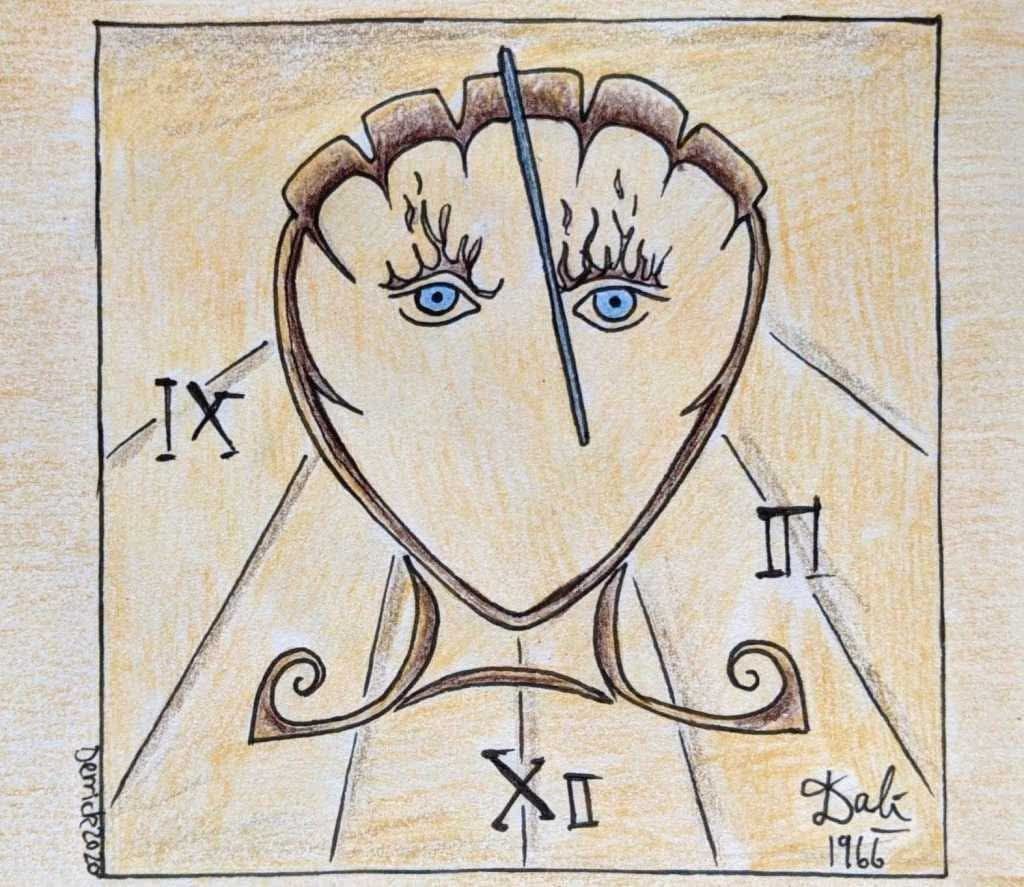 Si te fijas bien, verás más detalles en el reloj. Por ejemplo, que los ojos de la cara de la mujer son azules y que las cejas están formadas por pequeñas llamas que evocan al sol. El cabello de la representación cae sobre los hombros de una forma que recuerda al bigote del propio Dalí.